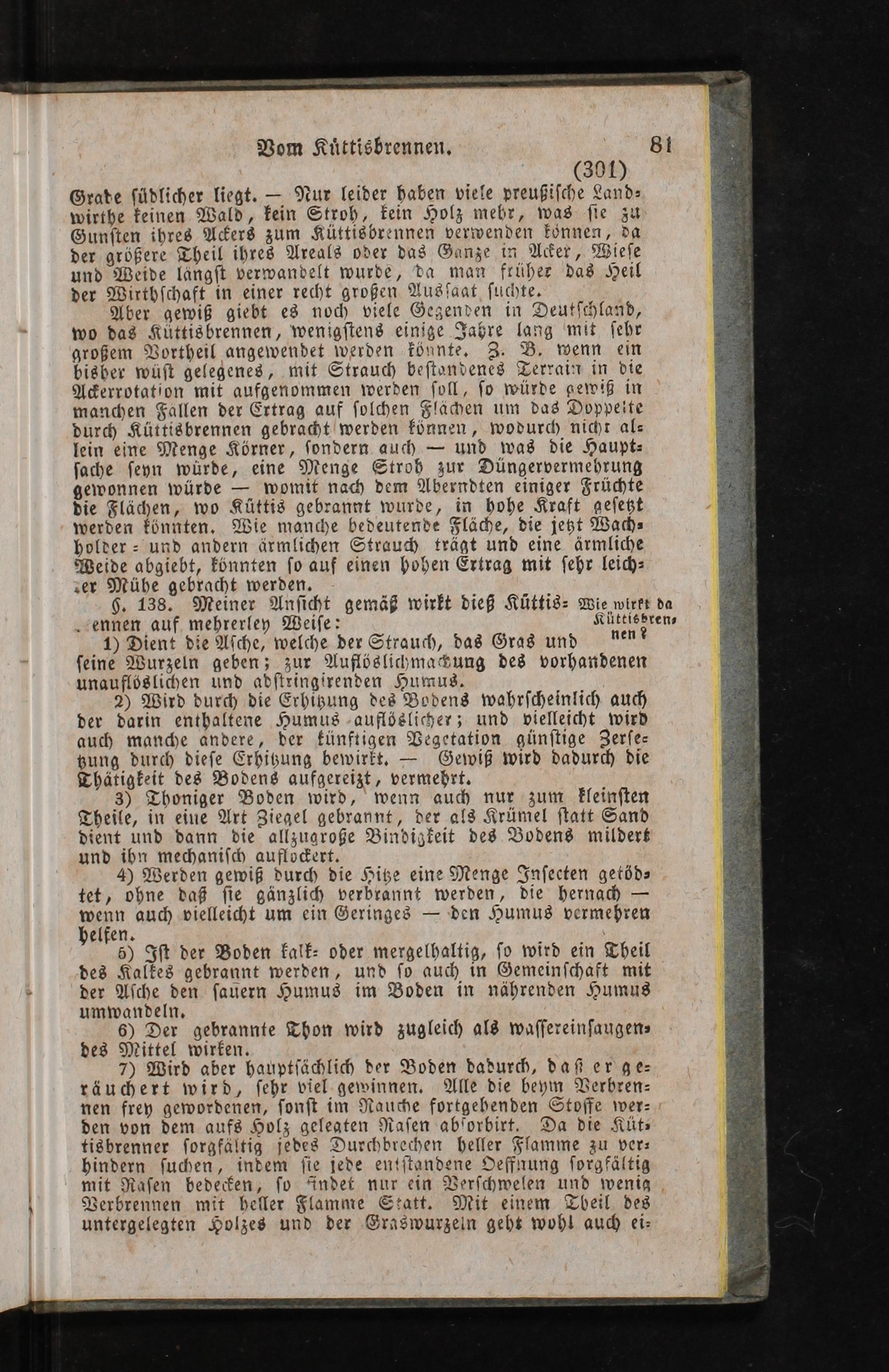5) Iſt der Boden kalk: oder mergelhaltig, ſo wird ein Theil des Kalkes gebrannt werden, und ſo auch in Gemeinſchäft mit der Aſche den ſauern Humus im Boden in nährenden Humus umwandeln,;