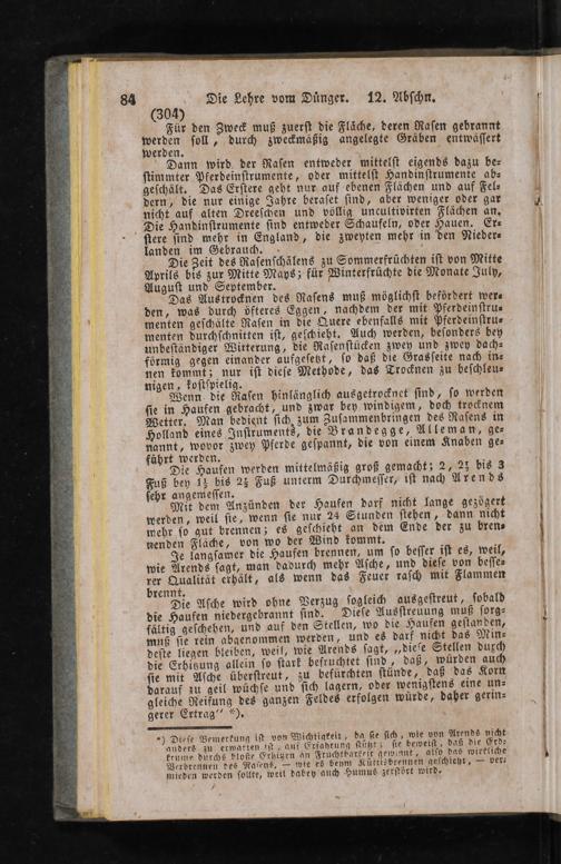 Die Aſche wird ohne Verzug ſogleich ausgeſtreut, ſobald die Haufen niedergebrannt ſind. Dieſe Ausſtreuung muß ſorg- fältig geſchehen, und auf den Stellen, wo die Haufen geſtanden, muß ſie rein abgenommen werden, und es darf nicht das Min- deſte liegen bleiben, weil, wie Arends ſagt,„dieſe Stellen durch die Erhitzung allein ſo ſtark befruchtet ſind, daß, würden auch ſie mit Aſche überſtreut, zu befürchten ſtünde, daß'das Korn darauf zu geil wüchſe und ſich lagern, oder wenigſtens eine un- gleiche Reifung des ganzen Feldes erfolgen würde, daber gerin- gerer Ertrag*),