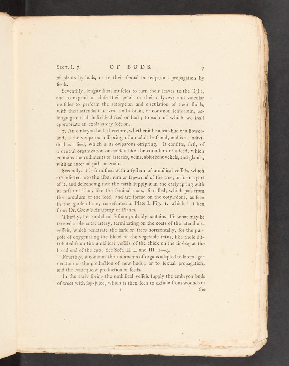 7. An embryon bud, therefore, whether it be a leaf-bud or a flower- bud, is the viviparous offspring of an adult leaf-bud, and is as indivi- dual as a feed, which is its oviparous offspring. It confifts, firft, of a central organization or caudex like the corculum of a feed, which contains the rudiments of arteries, veins, abforbent veflels, and glands, with an internal pith or brain.