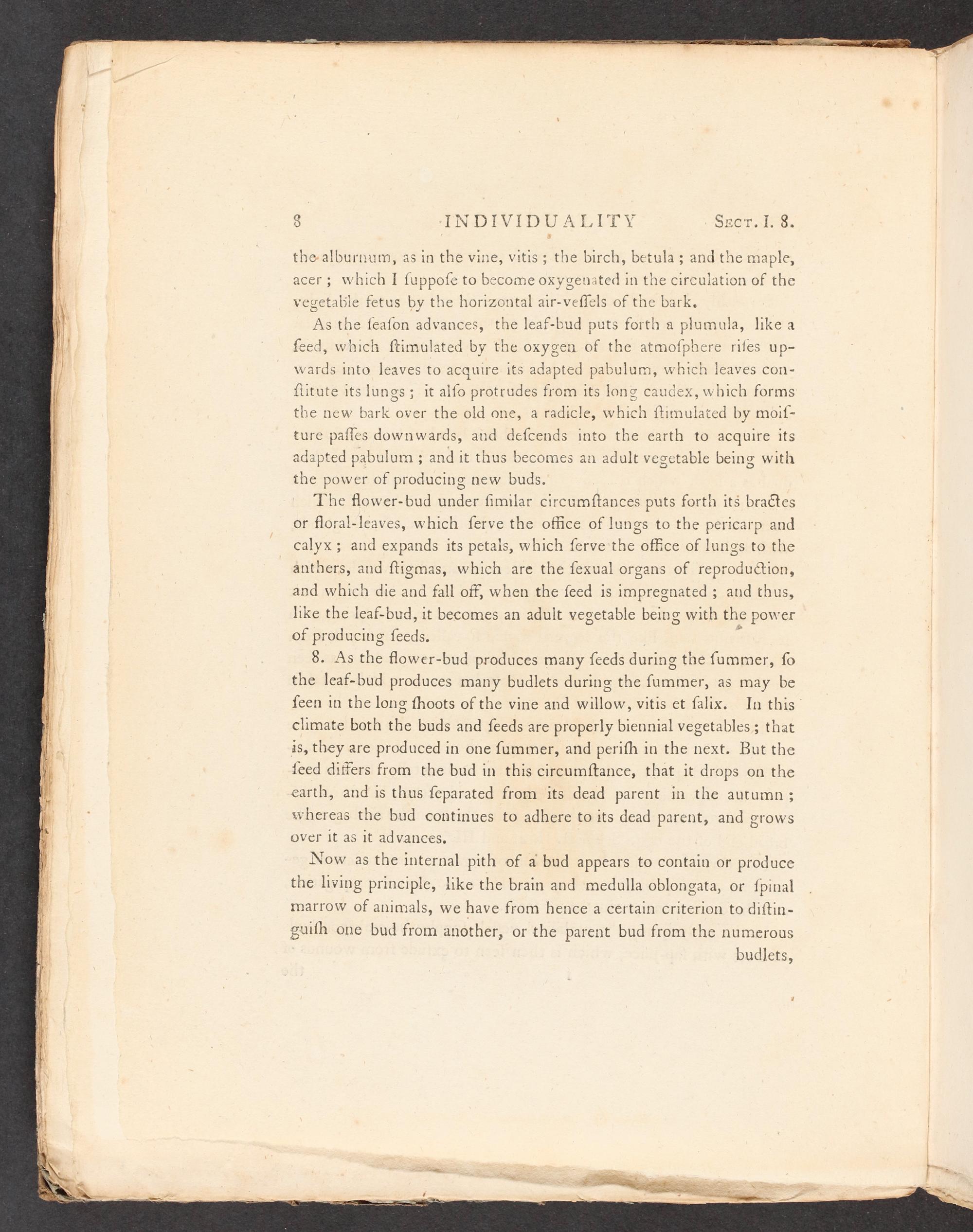 8. As the flower-bud produces many feeds during the fummer, fo the leaf-bud produces many budlets during the fummer, as may be feen in the long fhoots of the vine and willow, vitis et falix. In this climate both the buds and feeds are properly biennial vegetables; that 15, they are produced in one fummer, and perifh in the next. Butthe feed differs from the bud in this circumftance, that it drops on the earth, and is thus feparated from its dead parent in the autumn;