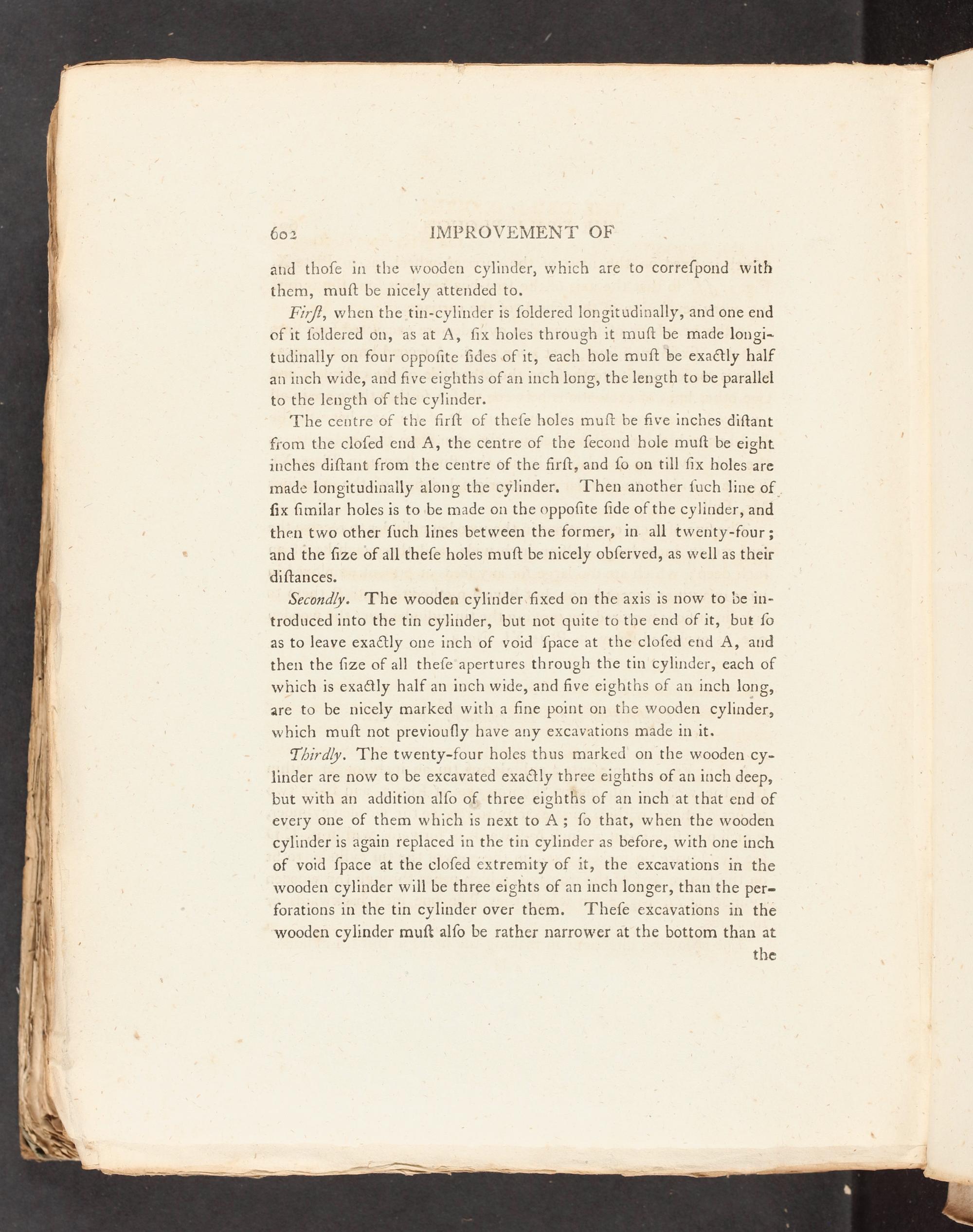 Second}y. The wooden cylinder fixed on the axis is now to be in- troduced into the tin cylinder, but not quite to the end ofit, but fo as to leave exa@tly one inch of void fpace at the clofed end A, aud then the fize of all thefe apertures through the tin cylinder, each of which is exa@ly half an inch wide, and five eighths of an inch long, are to be nicely marked with a fine point on the wooden cylinder, which muft not previoufly have any excavations made in it.