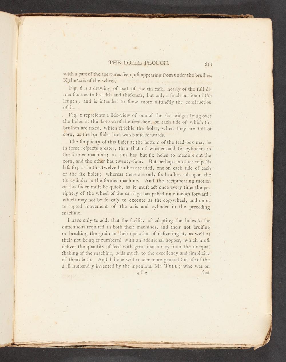 The fimplicity of this flider at the bottom of the feed-box may be in fome refpects greater, than‘that of wooden and tin cylinders in the former machine; as this has but fix holes to meafure out the corn, and the other has twenty-four. But perhaps in other refpects lefs fo; as in this twelve brufhes are ufed, one on each fide of each of the fix holes; whereas there are only fix brufhes rub upon the tin cylinder in the former machine. And the reciprocating motion of this Îlider muft be quick, as it muft aét once every time the pe- riphery of the wheel of the carriage has pañled nine inches forward; which may not be fo eafy to execute as the cog-wheel, and unin- terrupted movement of the axis and cylinder in the preceding machine.