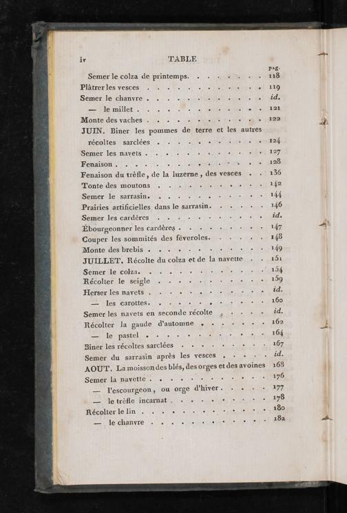 Sémer le sarrasineiif.:.@ à ere Prairies artificielles dans le sarrasin.+++ Sémériles cardères 2 Mel eee Rite ee Ébourgeonner lestcarderes.. he ssl che Couper les sommités des féveroles.…..... Monte des brebis....: 5 de JUILLET. Récolte du colza et de la navette Seémerile colza 100, eine Récoliécale seigle he hotes ne ÉTerser les navetsso ne en ner ae. PATES marOttes nt AL. Here en etes Semer les navets en seconde récolte;::+-:+ Récolter la gaude d'automne ie ee ea he pasiel ec le CR oi Diner les récoltes sarclées+++++: Semer du sarrasin après les vesces.:++:°: