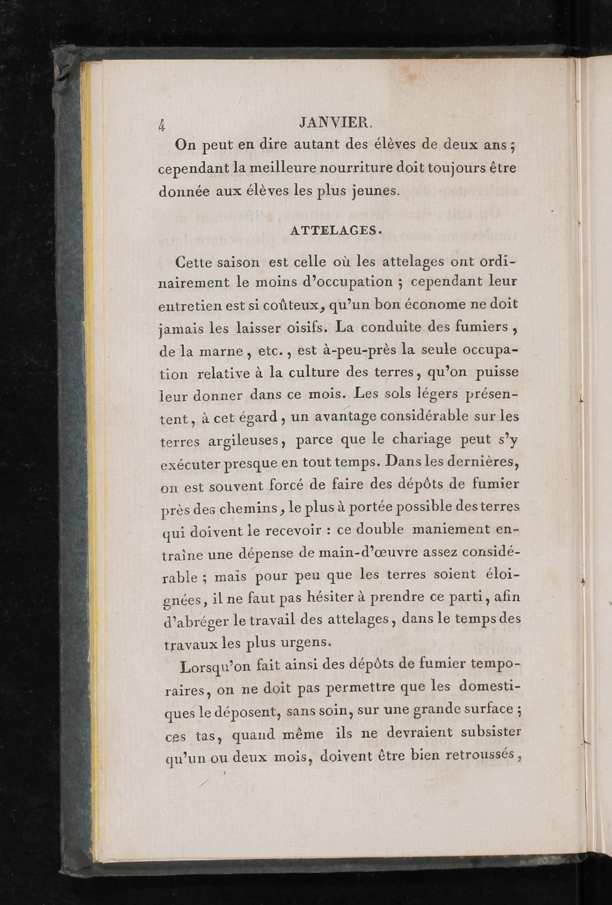 Cette saison est celle où les attelages ont ordi- nairement le moins d'occupation; cependant leur entretien est si coûteux, qu’un bon économe ne doit jamais les laisser oisifs. La conduite des fumiers, de la marne, etc., est à-peu-près la seule occupa- tion relative à la culture des terres, qu’on puisse jeur donner dans ce mois. Les sols légers présen- tent, à cet égard, un avantage considérable sur les terres argileuses, parce que le chariage peut s’y exécuter presque en tout temps. Dans les dernières, on est souvent forcé de faire des dépôts de fumier près des chemins, Le plus à portée possible desterres qui doivent le recevoir: ce double maniement en- traine une dépense de main-d'œuvre assez considé- rable; mais pour peu que les terres soient éloi- gnées, il ne faut pas hésiter à prendre ce parti, afin d’abréger le travail des attelages, dans le temps des travaux les plus urgens.