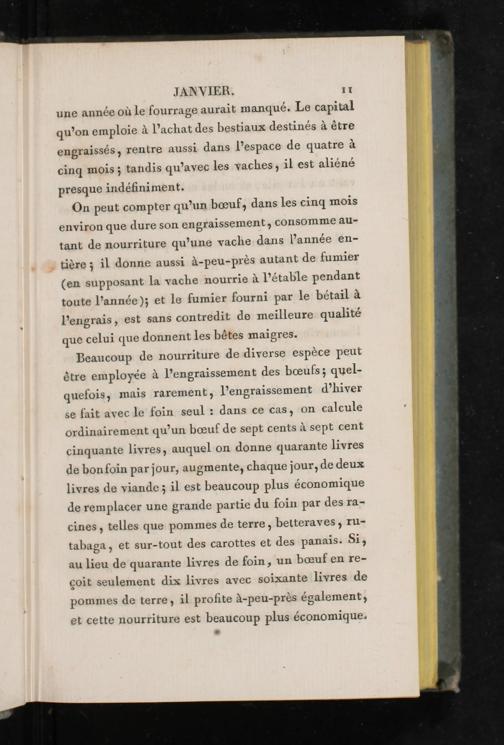 JANVIER. It une année où Le fourrage aurait manqué. Le capital qu’on emploie à l’achat des bestiaux destinés à être engraissés, rentre aussi dans l’espace de quatre à cinq mois; tandis qu’avec les vaches, il est aliéné presque indéfiniment.