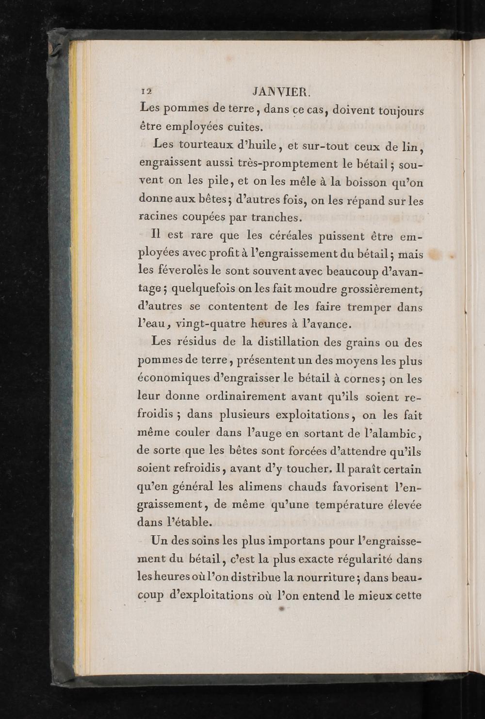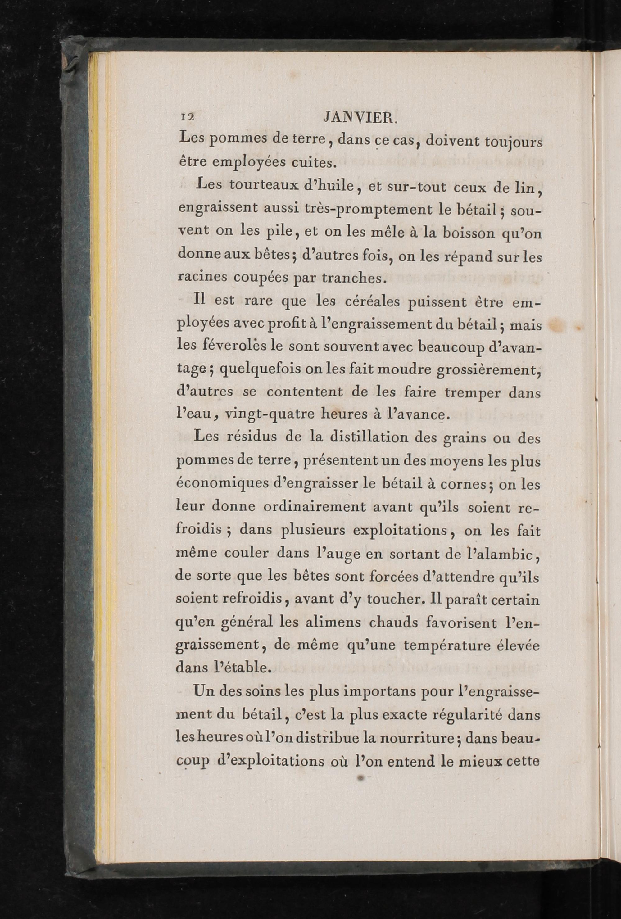 Un des soins les plus importans pour l’engraisse- ment du bétail, c’est la plus exacte régularité dans les heures où l’on distribue la nourriture; dans beau-