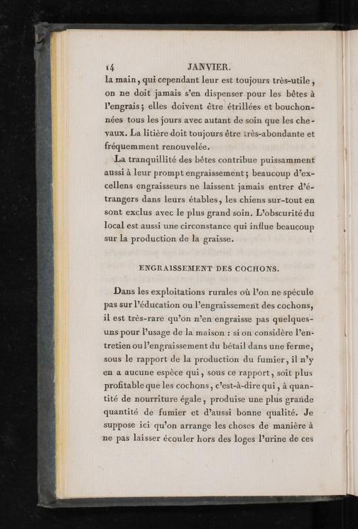 La tranquillité des bêtes contribue puissamment aussi à leur prompt engraissement; beaucoup d’ex- cellens engraïsseurs ne laissent jamais entrer d’é- trangers dans leurs étables, Les chiens sur-tout en sont exclus avec le plus grand soin. L’obscurité du local est aussi une circonstance qui influe beaucoup sur la production de la graisse.