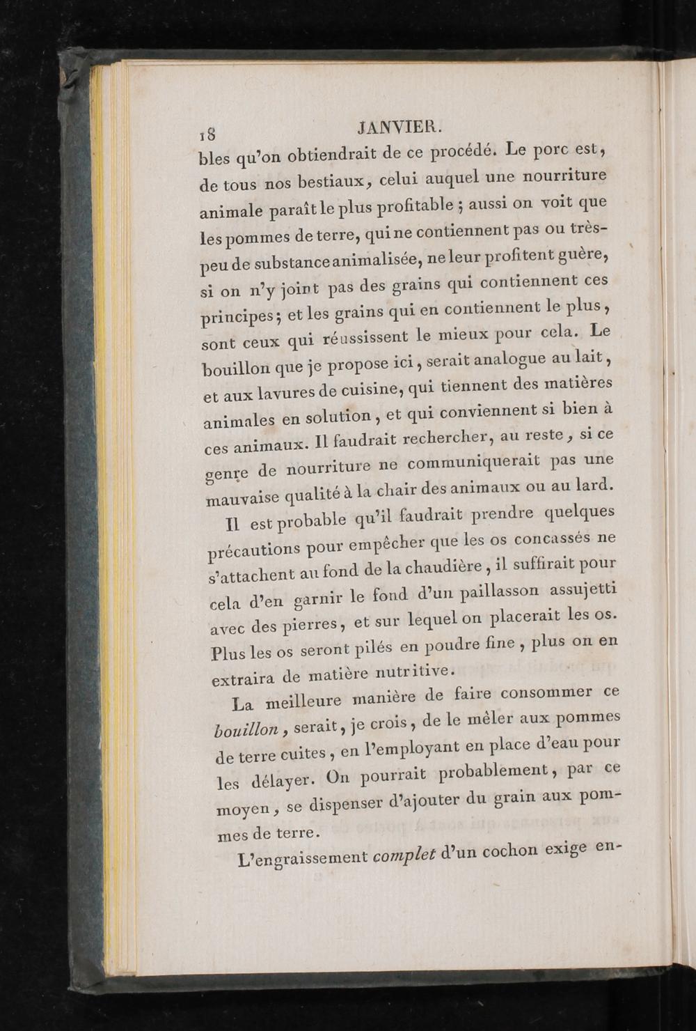 bles qu’on obtiendrait de ce procédé. Le porc est, de tous nos bestiaux, celui auquel une nourriture animale paraît le plus profitable; aussi on voit que les pommes deterre, qui ne contiennent pas Ou très- peu de substance animalisée, ne leur profitent guère, si on n’y joint pas des grains qui contiennent ces principes; et les grains qui en contiennent le plus, sont ceux qui réussissent le mieux pour cela. Le bouillon que je propose ici, serait analogue au lait, et aux lavures de cuisine, qui tiennent des matières animales en solution, et qui conviennent si bien à ces animaux. Il faudrait rechercher, au reste, si ce genre de nourriture ne communiquerait pas une mauvaise qualité à la chair des animaux ou au lard.