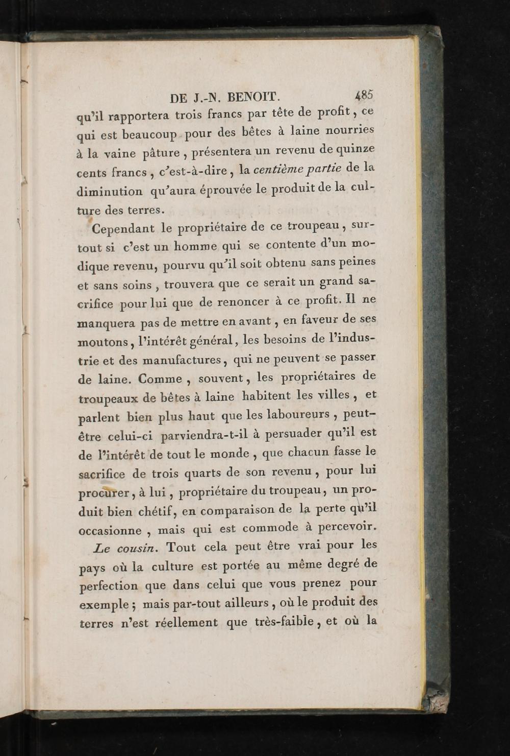 DE J.-N. BENOIT. 485 qu’il rapportera trois francs par tête de profit, ce qui est beaucoup. pour des bêtes à laine nourries à la vaine pâture, présentera un revenu de quinze cents francs, c’est-à-dire, la centième partie de la diminution qu’aura éprouvée le produit de la cul- ture des terres.