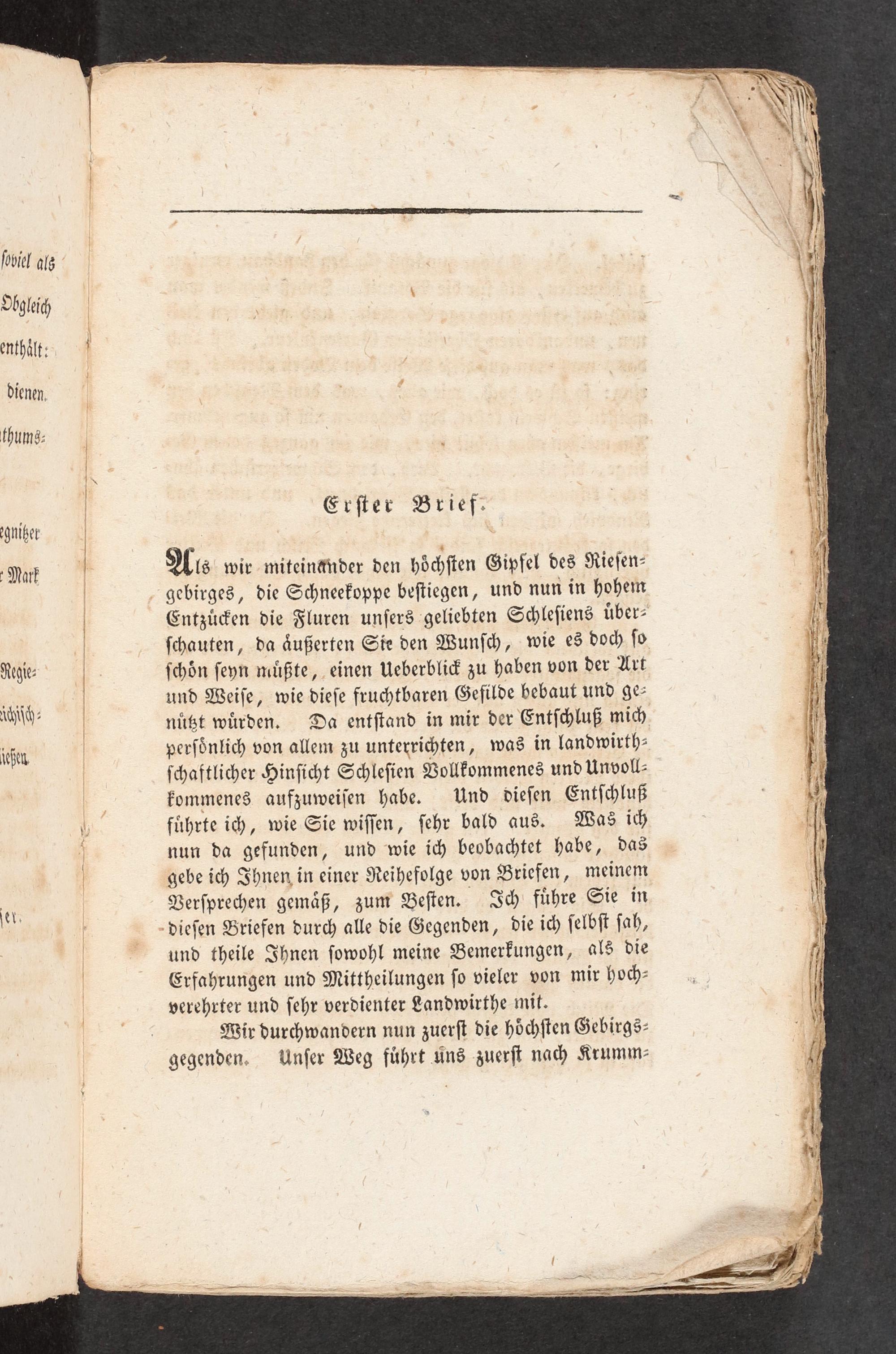 Dbylih enthält;| dienen,|; fhums: Erſter Brief. 'niker I Mir M Alls wir miteinänder den höchſten Gipfel des Rieſen- - gebirges, die Schneekoppe beſtiegen, und nun in hohem Entzü>en die Fluren unſers geliebten Schleſiens über- ſchauten, da äußerten Sie den Wunſch, wie es doch ſo Regie ſchön ſeyn müßte, einen Ueberbli> zu haben von der Art KH, und Weiſe, wie dieſe fruchtbaren Gefilde bebaut und ge- DUE nüßt würden. Da entſtand in mir der Entſchluß mich (eſe, perſönlich von allem zu unterrichten, was in landwirth- ſchaftlicher Hinſicht Schleſien Volkommenes und Unvoll-