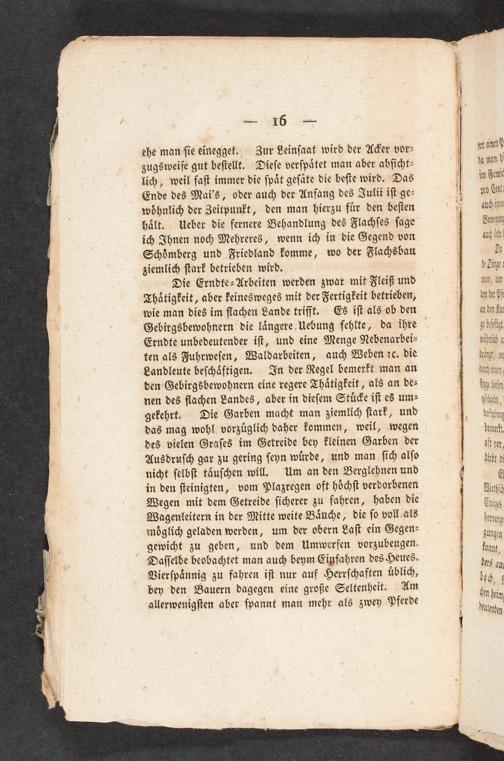 Die Erndte- Arbeiten werden zwar mit Fleiß und Thätigkeit, aber keinesweges mit der Fertigkeit betrieben, voie man dies im flachen Lande trifft. Es iſt als ob den Gebirgsbewohnern die längere Uebung fehlte, da Ihre Erndte unbedeutender iſt, und eine Menge Nebenarbei- ten als Fuhrweſen, Waldarbeiten, auch Weben 2c. die Landleute beſchäftigen. In der Regel bemerkt man an ven'Gebirgsbewohnern eine regere Thätigkeit, als an de- nen des flachen Landes, aber in dieſem Stüe iſt es um gekehrt. Die Garben macht man ziemlich ſtark, und das mag wohl vorzüglich daher kommen, weil, wegen des vielen Graſes im Getreide bey kleinen Garben der Ausdruſch gar zu gering ſeyn würde, und man ſich alſo nicht ſelbſt täuſchen will. Um an den Berglehnen und in den ſteinigten, vom Plazregen oft höchſt verdorbenen Wegen mit dem Getreide ſicherer zu fahren, haben die Wagenleitern in der Mitte weite Bäuche, die ſo voll als möglich geladen werden, um der obern Laſt ein Gegen- gewicht zu geben, und dem Umwerfen vorzubeugen. Daſſeibe beobachtet man auch beym Eipfahvren des Heues. Vierſpännig zu fahren iſt nur auf Herrſchaften üblich, bey den Bauern dagegen eine große Seltenheit. Am allerwenigſten aber ſpannt man mehr als zwey Pferde