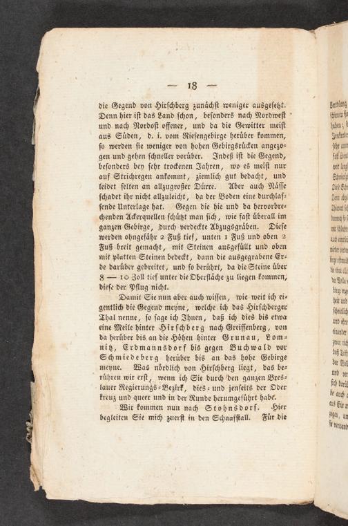 Thal nenne, ſo ſage ich Ihnen, daß ich dies bis etwa eine Meile hinter Hirſc<berg nach Greiffenberg, von da herüber bis an die Höhen hinter Grunau, Loms- niß, Erdmannsdorf bis gegen Buchwald vor Schmiedeberg herüber bis an das hohe Gebirge meyne. Was nördlich von Hirſchberg liegt, das be- rühren wir erſt, wenn ich Sie durch'den ganzen Bres- - lauer Regierungs- Bezirk, dies- und jenſeits der Oder Freuz und queer und in der Runde herumgeführt habe.