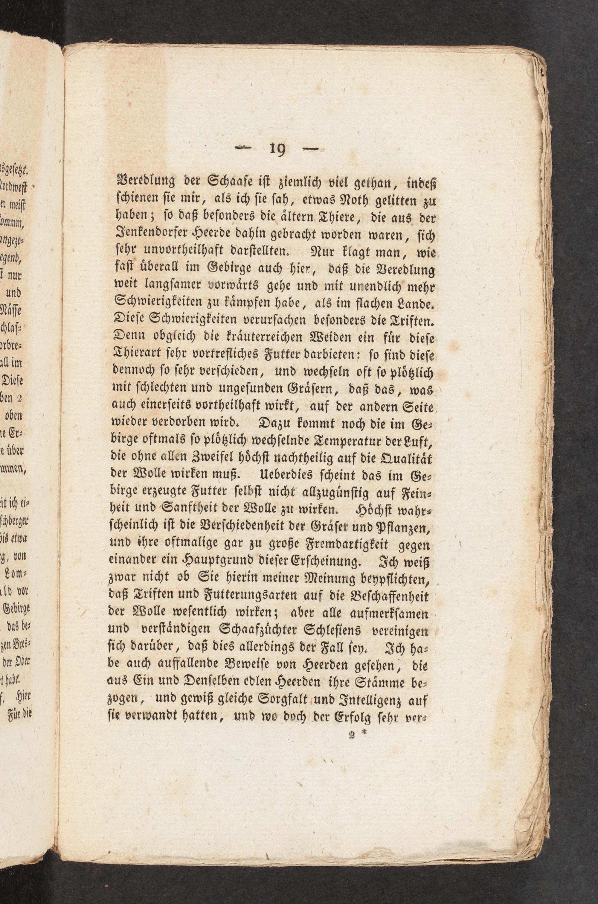 dennoch ſo ſehr verſchieden, und wechſeln oft ſo plößlich mit ſchlechten und ungeſunden Gräſern, daß das, was auch einerſeits vortheilhaft wirkt, auf der andern Seite. wieder verdorben wird. Dazu kommt noch die im Ge- birge oftmals ſo plößlich wechſelnde Temperatur der Luft, die ohne allen Zweifel höchſt nachtheilig auf die Qualität der Wolle wirken muß. Ueberdies ſcheint das im Ge- birge erzeugte Futter ſelbſt nicht allzugünſtig auf Fein- heit und Sanftheit der Wolle zu wirken. Höchſt wahr- ſcheinlich iſt die Verſchiedenheit der Gräſer und Pflanzen, und(hre oftmalige gar zu große Fremdartigkeit gegen einander ein Hauptgrund dieſer Erſcheinung. I< weiß zwar nicht ob Sie hierin meiner Meinung beypflichten, daß Triften und Futterungsarten auf die Beſchaffenheit der Wolle weſentlich wirkenz äber alle aufmerkſamen und verſtändigen Schaafzüchter Schleſiens vereinigen ſich darüber, daß dies allerdings der Fall fey. I< ha- be auch auffallende Beweiſe von Heerden geſehen, die aus Ein und Denſelben edlen Heerden ihre Stämme be- zogen, und gewiß gleiche Sorgfalt[und Intelligenz auf ſie verwandt hatten, und wo doch der Erfolg ſehr ver- 2*