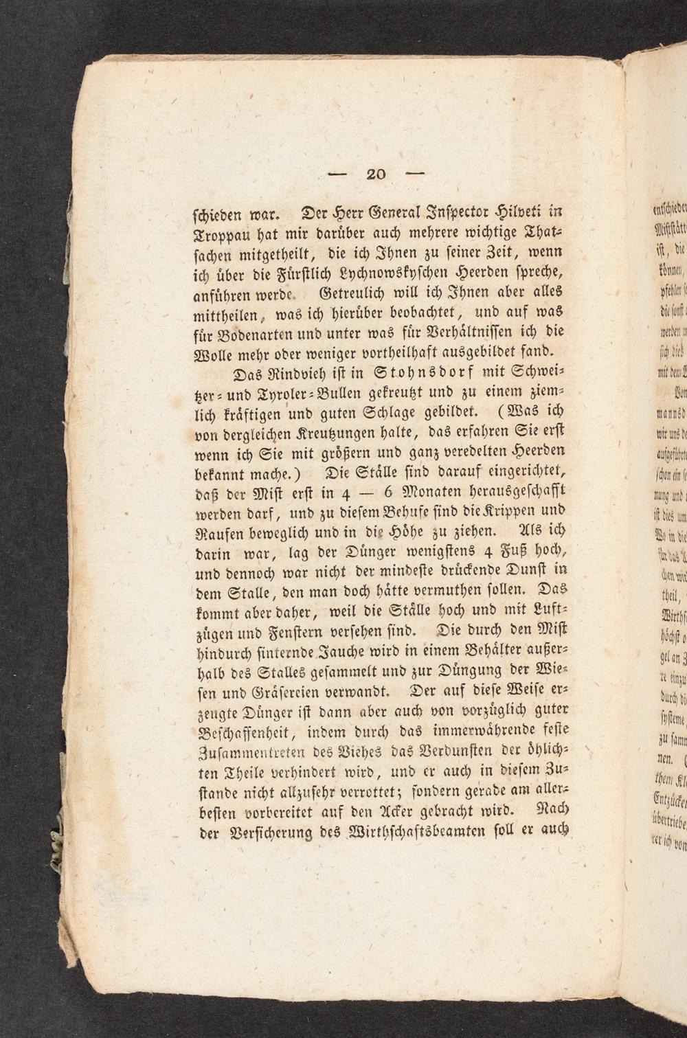 ſchieden war. Der Herr General Infpector Hilveti in(niſcht Troppau hat mir darüber auch mehrere wichtige That- gift ſachen mitgetheilt, die ich Ihnen zu ſeiner Zeit, wenn R, dv ich über die Fürſtlich Ly<nowskyſchen Heerden ſpreche, EON, anführen werde. Getreulich will ih Ihnen aber alles pfehle| mittheilen, was ich hierüber beobachtet, und auf was dieſuf für Bodenarten und unter was für Verhältniſſen ich die* pere Wolle mehr oder weniger vortheilhaft ausgebildet fand. fin die) Das Rindvieh iſt in Stohnsdorf mit Schwei- nit dan! ßer- und Tyroler- Bullen gekreußt und zu einem ziem-. et lich kräftigen und guten Schlage gebildet,(Was ich wanhä) von dergleichen Kreußungen halte, das erfahren Sie erſt wir un) wenn ich Sie mit größern und ganz veredelten Heerden; wipfht bekannt mache.) Die Ställe ſind darauf eingerichtet, ſhi daß der Miſt erſt in 4=-- 6 Monaten herausgeſchafft mung u: werden darf, und zu dieſem Behufe ſind die Krippen und dies um Raufen beweglich und in die Höhe zu ziehen. Als ich Beih darin war, lag der Dünger wenigſtens 4 Fuß ho<, wg und dennoch war nicht der mindeſte drü>ende Dunſt in fans dem Stalle, den man doch hätte vermuthen ſollen. Das dei| kommt aber daher, weil die Ställe hoch und mit Luft- Bic zügen und Fenſtern verſehen ſind. Die durch den Miſt jf» hindurch ſinternde Jauche wird in einem Behälter außer- Wr; halb des Stalles geſammelt und zur Düngung der Wie» fm ſen und Gräſereien verwandt. Der auf dieſe Weiſe er- Nn zeugte Dünger iſt dann aber auch yon vorzüglich guter Dem Beſchafenheit, indem durc< das immerwährende feſie iH N Zuſammentreten des Viehes das Verdunſten der dhlich:| Jam ten Theile verhindert wird, und er auch in dieſem Zu- 0. ?. WBl DIC RWEE hem Rl ſtande nicht allzuſehr verrottet3 fondern gerade am aller- Miihe beſten vorbereitet auf den A>er gebracht wird. Nay Wan '