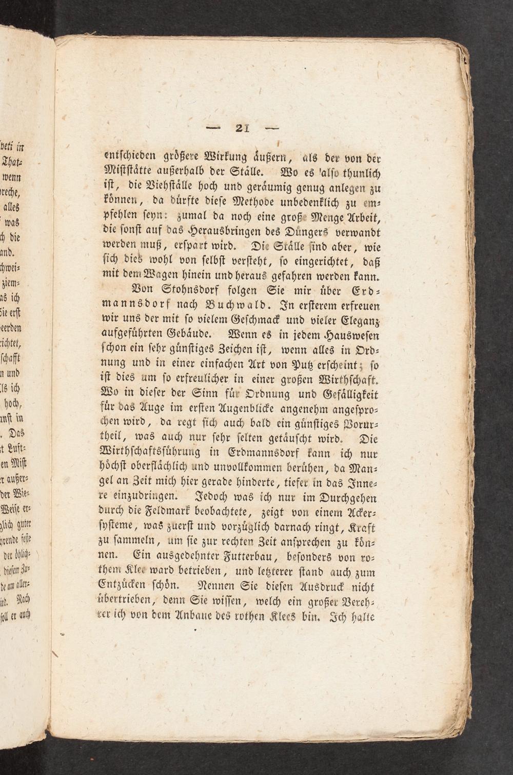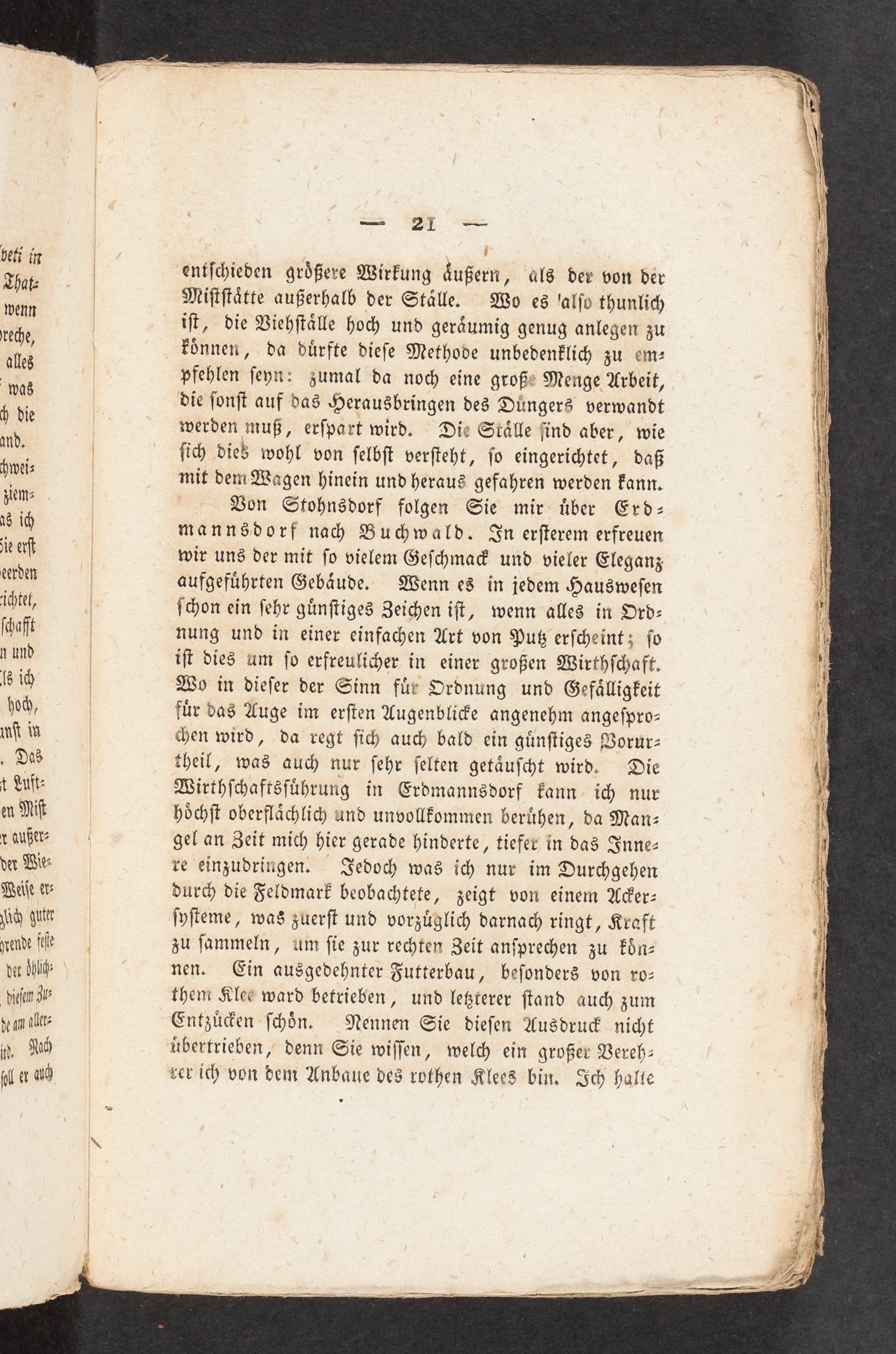 WEN CHO|[| 9 I;| entſchieden größere Wirkung äußern, als der von der J 1| Miſtſtätte außerhalb der Ställe. Wo es'alſo thunlich 0, H| iſt, die Viehſtälle hoc< und geräumig genug anlegen zu| ,| können, da dürfte dieſe Methode unbedenklich zu em-) DI| pfehlen ſeyn: zumal da noch eine große Menge Arbeit,) was die ſonſt auf das Herausbringen des Düngers verwandt jW, h die werden muß, erſpart wird. Die Ställe ſind aber, wie| md.| ſich dieb wohl von ſelbſt verſteht, ſo eingerichtet, daß|| hwei-| mit dem Wagen hinein und heraus gefahren werden kann.(4 WM=+| Bon Stohnsdorf folgen Sie mir über Erd- j x ich| mannsdorf nah Buchwald. Jn erſterem erfreuen"1 je eſ| wir uns der mit ſo vielem Geſchma> und vieler Eleganz 8! eerden| aufgeführten Gebäude. Wenn es in jedem Hausweſen IN ichtet,| ſchon ein ſehr günſtiges Zeichen iſt, wenn alles in Ord- 1 ſchafft| nung und in einer einfachen Art von Puß erſcheint; ſo 0? n und| iſt dies um ſo erfreulicher in einer großen Wirthſchaft. be (6 19| Wo in dieſer der Sinn für Ordnung und Gefälligkeit 4 hoh,| für das Auge im erſten Augenblie angenehm angeſpro-" vſt in|<en wird, da regt ſich auch bald ein günſtiges Vorur- vi . Das| theil, was auch nur ſehr ſelten getäuſcht wird. Die y t Luſt: Wirthſchaftsführung in Erdmannsdorf kann ich nur KB en Niſf| höchſt oberflächlich und unvollkommen berühen, da Man- SE 1701122200008 gel an Zeit mich hier gerade hinderte, tiefer in das Inne-| der Wie- re einzudringen. Jedoch was ich nur im Durchgehen IN Waiſe et- durch die Feldmark beobachtete, zeigt von einem Ader-| dach uter ſyſteme, was zuerſt und vorzüglich darnach ringt, Kraft| wende fe| zu ſammeln, um ſie zur rechten Zeit anſprechen zu kbön-| der Öhlige nen. Ein ausgedehnter Futterbau, beſonders von ro- j biſa Zu them Klees ward betrieben, und leßterer ſtand auch zum vs i" ve am al Entzü>en ſchön. Nennen Sie dieſen Ausdru> nicht| +». uh übertrieben, denn Sie wiſſen, welch ein großer Vereh-( al er au) zer ich von dem Anbaue des rothen Klee3 bin, Ich halte;