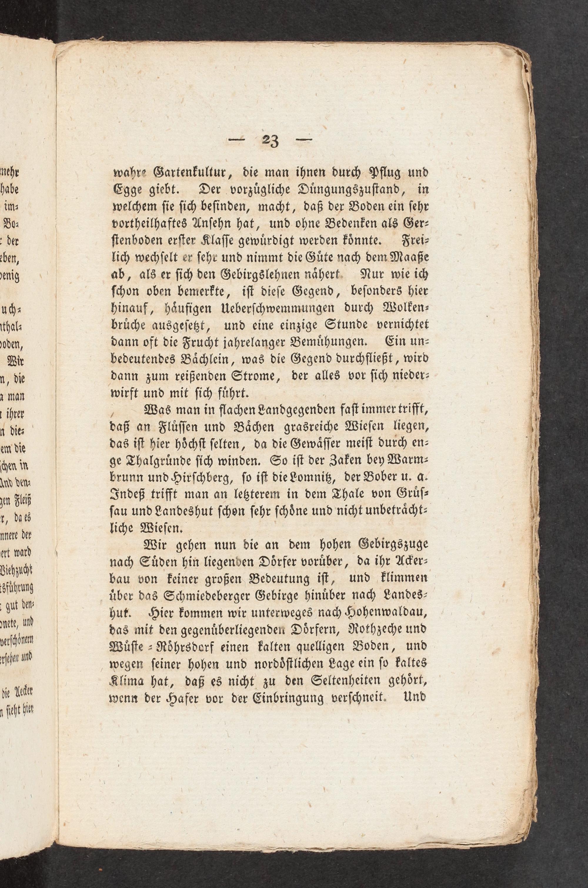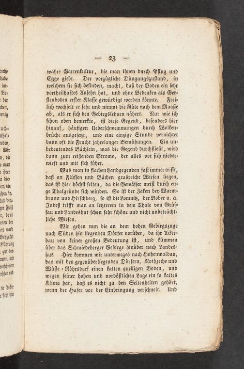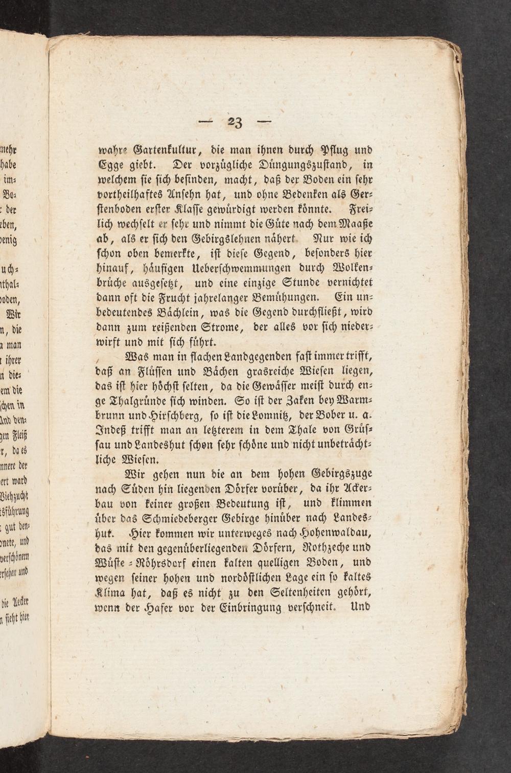 4 Was man in flachen Landgegenden faſt immer trifft, daß an Flüſſen und Bächen grasreiche Wieſen liegen, das iſt hier höchſt ſelten, da die Gewäſſer meiſt durch en- ge Thalgründe ſich winden. So iſt der Zaken bey Warm- brunn und Hirſchberg, ſo iſt die Lomniß, der Bober u. a. Indeß trifft man an leßterem in dem Thale von Grüſ- ſau und Landeshut ſchon ſehr ſchöne und nicht unbeträcht- liche Wieſen.