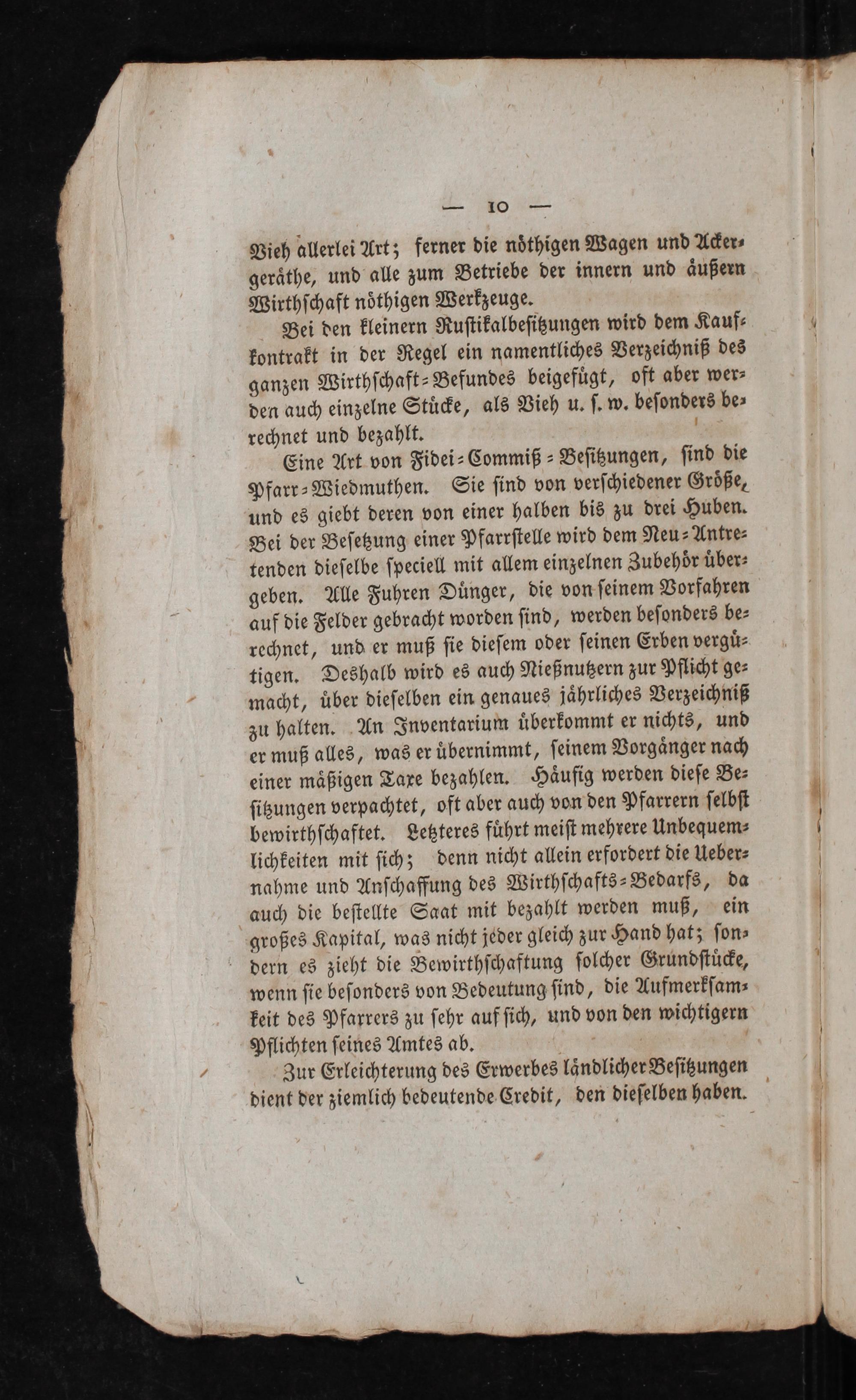 Eine Art. von Fidei- Commiß- Beſißungen, ſind die Pfarr-Wiedmuthen. Sie ſind von verſchiedener Größe, und es giebt deren von einer halben bis zu drei Huben. Bei der Beſekung einer Pfarrſtelle wird dem Neu- Antre- tenden dieſelbe ſpeciell mit allem einzelnen Zubehör über: geben. Alle Fuhren Dünger, die von ſeinem Vorfahren auf die Felder gebracht worden ſind, werden beſonders be- rechnet, und er muß ſie dieſem oder ſeinen Erben vergü- tigen. Deshalb wird es auch Nießnußern zur Pflicht ge- macht, über dieſelben ein genaues jährliches Verzeichniß zu halten..An Inventarium überkommt er nichts, und er muß alles, was er übernimmt, ſeinem Vorgänger nach einer mäßigen Taxe bezahlen. Häufig werden diefe Be- ſizungen verpachtet, oft aber auch von den Pfarrern ſelbſt bewirthſchaftet. Leßteres führt meiſt mehrere Unbequem- lichkeiten mit ſich; denn nicht allein erfordert die Ueber- nahme und Anſchaffung des Wirthſchafts- Bedarfs, da auch die beſtellte Saat mit bezahlt werden muß, ein großes Kapital, was nicht jeder gleich zur Hand hatz ſon» dern es zieht die Bewirthſchaftung folcher Gründſtüe, wenn ſie beſonders von Bedeutung ſind, die Aufmerkſam»- keit des Pfaxrers zu ſehr auf ſich, und von den wichtigern Pflichten ſeines Amtes ab.|'