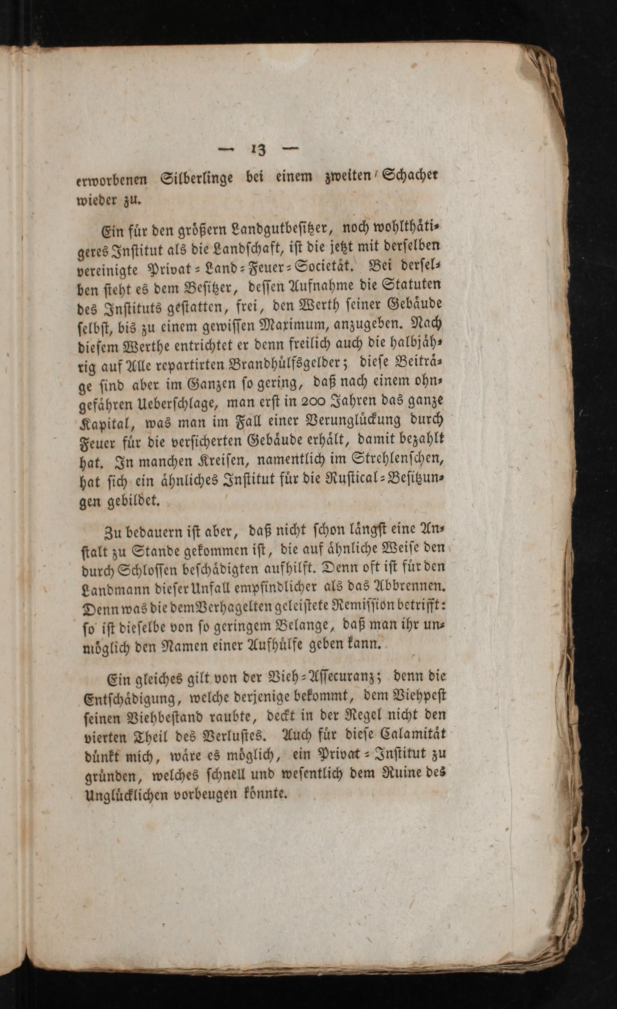 Ein gleiches gilt von der Vieh-Aſſecuranzz denn die Entſchädigung, welche derjenige bekommt, dem Viehpeſt ſeinen Viehbeſtand raubte, de&t in der Regel nicht den vierten Theil des Verluſtes. Auch für dieſe Calamität dünkf mich, wäre es möglich, ein Privat--Inſtitut zu gründen, welches ſchnell und weſentlich dem Ruine des Unglü&lichen vorbeugen könnte.