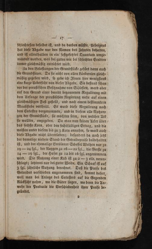 ſchlechteſten beſoldet iſt, und da darben müßte." Uebrigens hat dieſe Abgabe nur den Namen des Zehnten behalten, und iſt allenthalben in ein“ feſtgeſeßtes Quantum umge-' wändelt worden, was bei guten wie bei ſchlechten Giiwlett immer gleichmäßig entrichtet wird.- "Zu den Belaſtungen der GrundſtüFe gehört dann 4. die Grundſteuer. Da ſie nicht von allen Ländereien gleich»- mäßig" gegeben wird, ſd gebe ich Ihnen hier wenigſtens. eine kurze Ueberſicht von dieſer Abgabe. Sie beſtand ſchon: vor der preußiſchen Beſiknahme von Schleſien, ward aber. auf den Grund einer bereits begonnenen Regulirung mit dem Anfange der preußiſchen Negierung mehr auf einen. gleichmäßigen Fuß geſtellt,"und nach einem beſtimmtern Maaßſtabe vertheilt. Es' ward dieſe Regulirung nach» dem Cataſtro vorgenommen, und in dieſem alle Nußun» gen der Grundſtü>e, ſie mochten ſeyn, von welcher Art ſie wollten, angegeben. Da man nun keinen Aer über das ſechſte'Korn, oder den ſechsfältigen Ertrag, und die meiſten unter dieſem bis zu 3 Korn annahm, ſo ward auch. dieſe Abgabe nicht übertriebenz/ beſonders da noch jeßt der damalige niedere Stand der Getreidepreiſe beibehalten iſt, und der ehemalige Breslauer Scheffel Weißen nur zu 19=- 24 ſgl., der Roggen zu 16=-22 ſgl., die Gerſte zu 14=- 19 ſgl., der Hafer zu 12.bis 16 ſgl, angenommen.