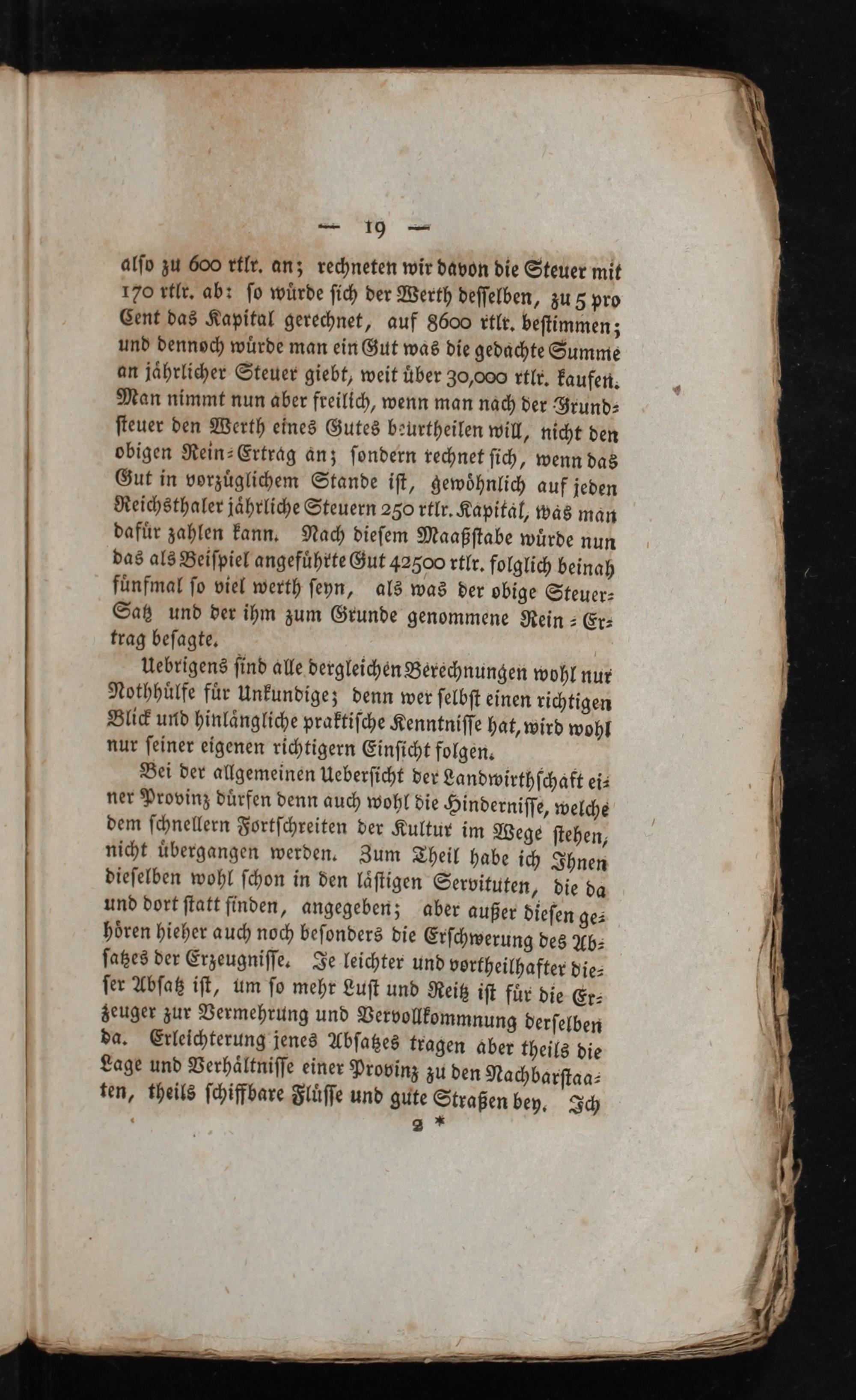 alſv zu 600 rtlr, anz rechneten wir dävon die Steuer mit 170 rtlt, ab: ſo würde ſich der Werth deſſelben, zu 5 pro Cent das Kapital gerechnet, auf 8600 rtlt, beſtimmen; und dennoch würde man ein Gut wäs die gedächte Sumnie an jährlicher Steuer giebt, weit über 30,000 rtlr. kaufen. Man nimmt nun äber freilich, wenn man nach der Zrund- ſteuer den Werth eines Gutes bzurtheilen will, nicht den obigen Rein- Erträg änz ſondern rechnet ſich, wenn das Gut in vorzüglichem Stande iſt, gewöhnlich auf jeden Reichsthaler jährliche Steuern 250 rtlr. Kapitäl, was män dafür zahlen kann, Nach dieſem Maaßſtabe würde nun das als Beiſpiel angeführte Gut 42500 rtlr. folglich beinah fünfmal ſo viel werth ſeyn, als was der obige Steuer- Saß und der ihm zum Grunde genommene Rein- Er- trag beſagte,