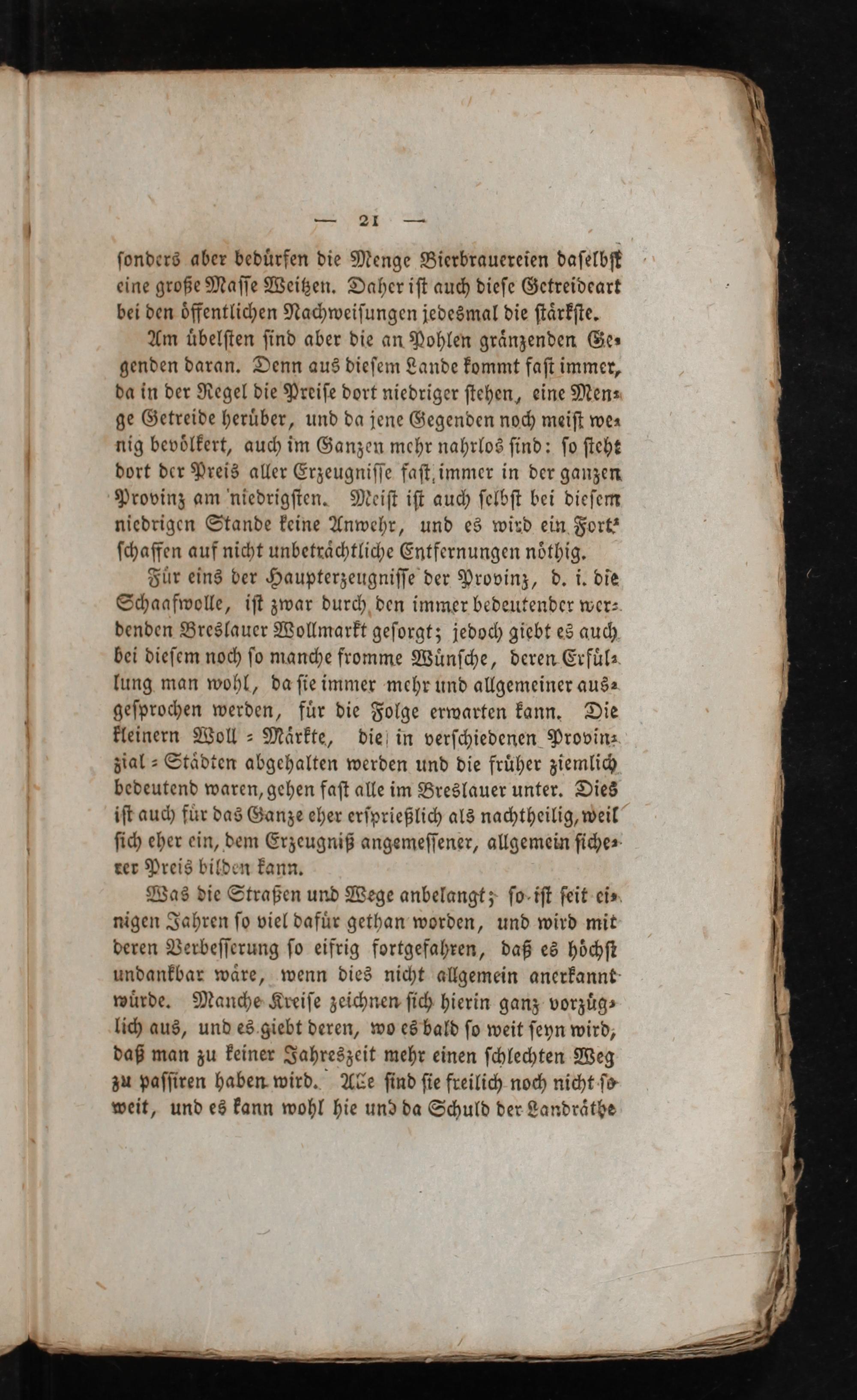 Für eins ver Haupterzeugniſſe der Provinz, d. i. die Schaafwolle, iſt zwar durch den immer bedeutender wer=. denden Breslauer Wollmarkt geſorgt; jedoch giebt es auch bei dieſem noch ſo manche fromme Wünſche, deren Erfüls. lung man wohl, da ſie immer mehr und allgemeiner aus2 geſprochen werden, für die Folge erwarten kann. Die kleinern Woll- Märkte, die] in verſchiedenen Provinz. zial- Städten abgehalten werden und die früher ziemlich bedeutend waren, gehen faſt alle im Breslauer unter. Dies iſtauch für das Ganze eher erſprießlich als nachtheilig, weil ſich eher ein, dem Erzeugniß angemeſſener, allgemein fiche» rer Preis bilden kann.
