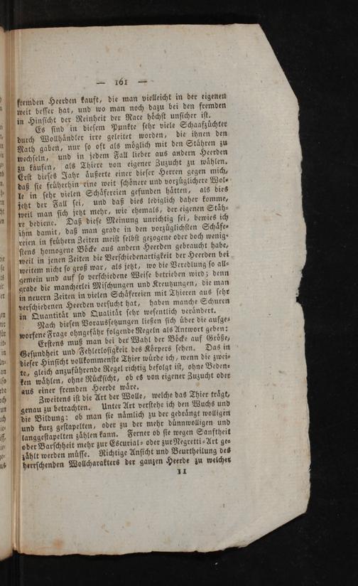 Zweitens iſt die Art der Wolle, welche das Thier trägt; genau zu betrachten. Unter Art verſtehe ic) den Wuchs und die Bildung: ob man ſie nämlich zu der gedrängt wolligen und kurz geſtapelten, oder zu der mehr dünnwolligen. und langgeſtapelten zählen kann. Ferner ob ſie wegen Sanftheit oder Barſchheit mehr zur Escurial» oder zur Negretti- Art ges zählt werden müſſe. Richtige Anſicht und Beurtheilung des herrſchenden Wollſcharakters der ganzen Heerde zu welches