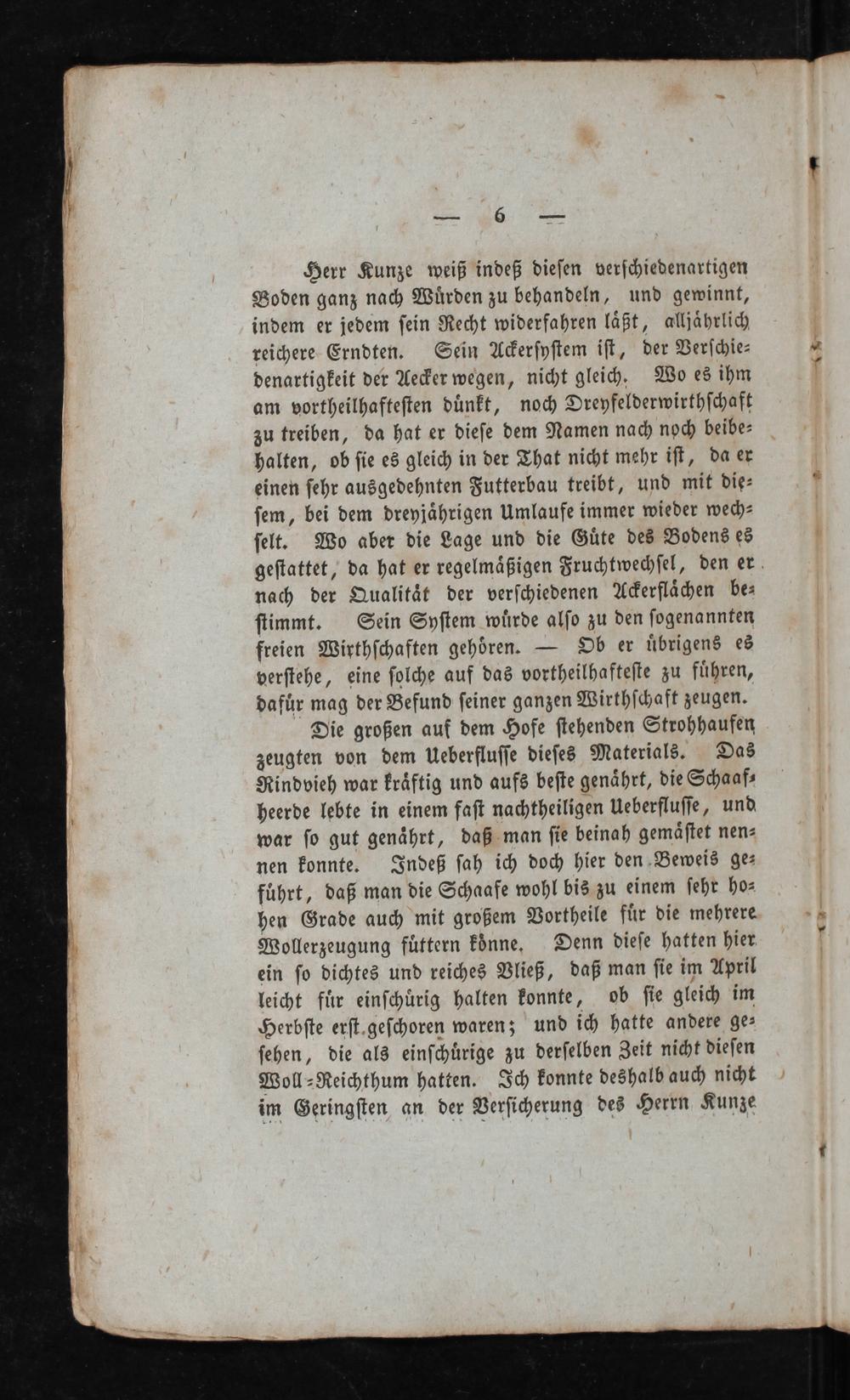 Die großen auf dem Hofe ſtehenden Strohhaufen zeugten von dem Ueberfluſſe dieſes Materials. Das Rindvieh war kräftig und aufs beſte genährt, die Schaaf- heerde lebte in einem faſt nachtheiligen Ueberfluſſe, und war ſo gut genährt, daß man ſie beinah gemäſtet nen- nen konnte. Indeß ſah ich doch hier den.Beweis ges führt, daß man die Schaafe wohl bis zu einem ſehr ho- hen Grade auc< mit großem Vortheile für die mehrere Wollerzeugung füttern könne, Denn dieſe hatten hier, ein ſo dichtes und reiches Vließ, daß man ſie im April leicht für einſchürig halten konnte, ob ſie gleich im Herbſte erſt.geſchoren waren; und ich hatte andere ge- ſehen, die als einſchürige zu derſelben Zeit nicht dieſen Woll-Reichthum hatten. I< konnte deshalb auch nicht im Geringſten an der Verſicherung des Herrn Kunze