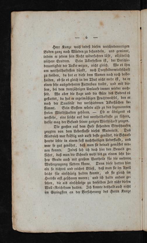 Herr Kunze weiß indeß dieſen verſchiedenartigen Boden ganz nac< Würden zu behandeln, und gewinnt, indem er jedem ſein Recht widerfahren läßt, alljährlich reichere. Erndten. Sein Aderſyſtem iſt, der Verſchie- denartigkeit der Ae>er wegen, nicht gleich. Wo es ihm am vortheilhafteſten dünkt, no< Dreyfelderwirthſc<haft zu treiben, da hat er dieſe dem Namen nach noch beibe-