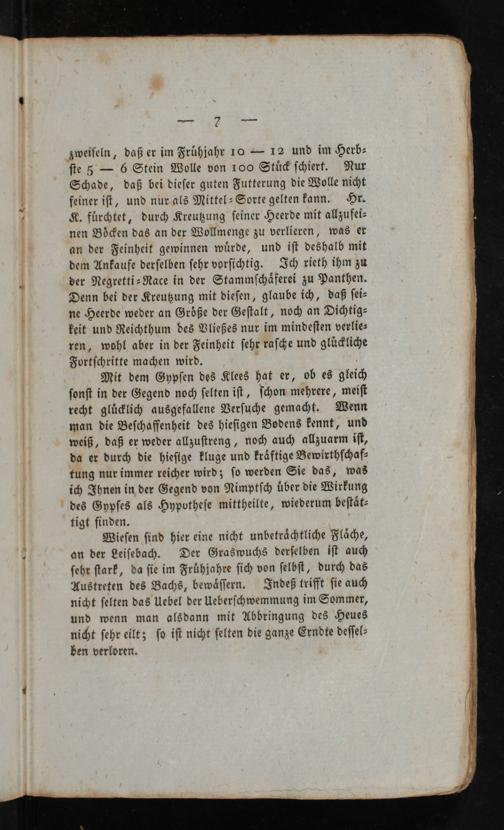 Mit dem Gypſen des Klees hat er, ob es äleich ſonſt in der Gegend noch ſelten iſt, ſchon mehrere, meiſt recht glüklich ausgefallene Verſuche gemacht. Wenn man die Beſchaffenheit des hieſigen Bodens kennt, und weiß, daß er weder allzuſtreng, noh auch allzuarm iſt, da er durch die hieſige kluge und kräftige Bewirthſc<haf- tung nur immer reicher wird 3; ſo werden Sie das, was ich Ihnen in der Gegend von Nimptſch über die Wirkung des Gypſes als Hypotheſe mittheilte, wiederum beſtät- tigt finden.