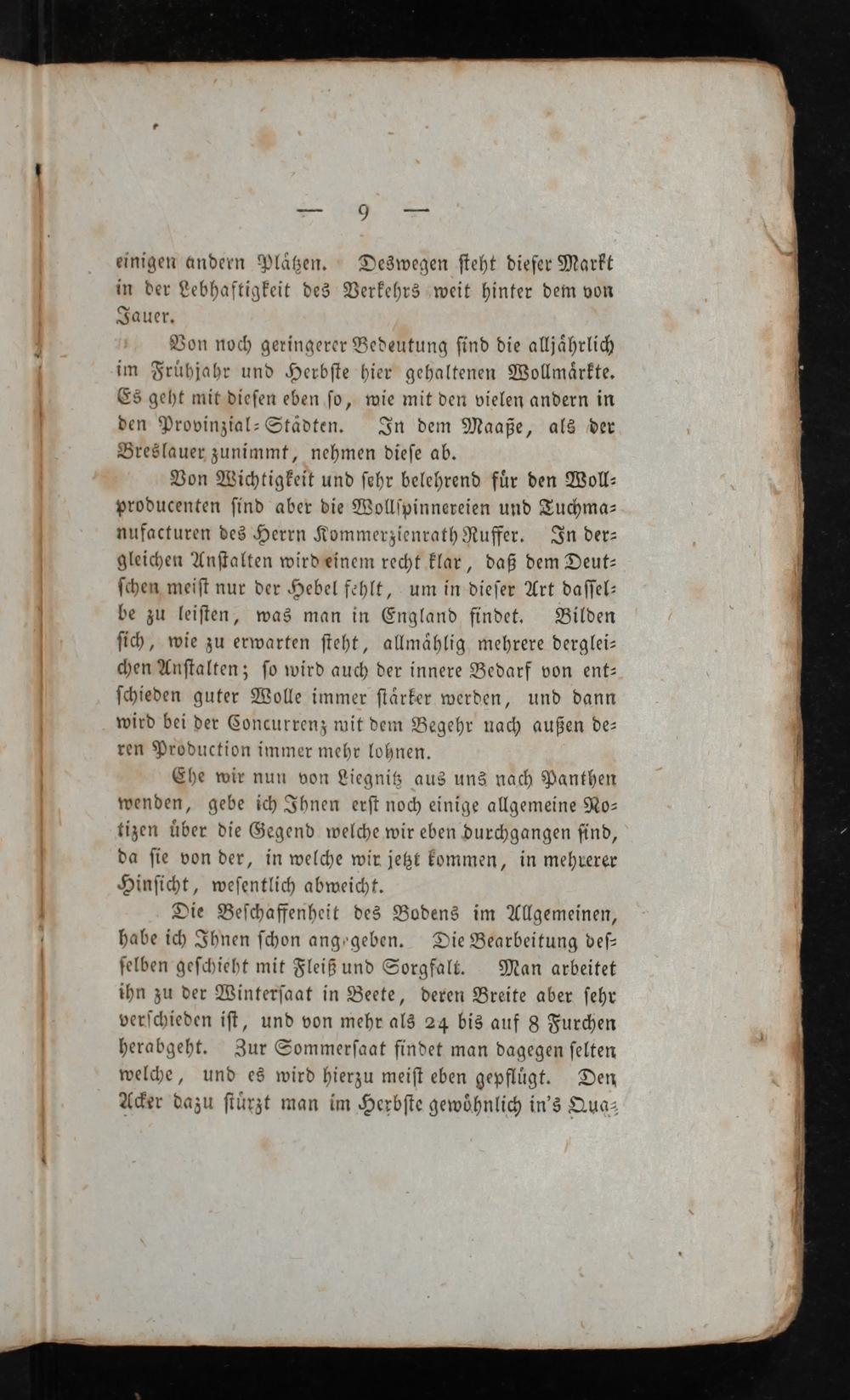 Von Wichtigkeit und ſchr belehrend für den Woll- producenten ſind aber die Wollſpinnereien und Tuchma- nufacturen des Herrn Kommerzienrath Ruffer, In der- gleichen Anſtalten wirdeinem recht klar, daß dem Deut- ſchen meiſt nur der Hebel fehlt, um in dieſer Art daſſel- be zu leiſten, was man in England findet. Bilden ſich, wie zu erwarten ſteht, allmählig mehrere derglei- <en Anſtalten; ſo wird auch der innere Bedarf von ent- ſchieden guter Wolle immer ſtärker werden, und dann wird bei der Concurrenz wit dem Begehr nach außen de- ren Production immer mehr lohnen.
