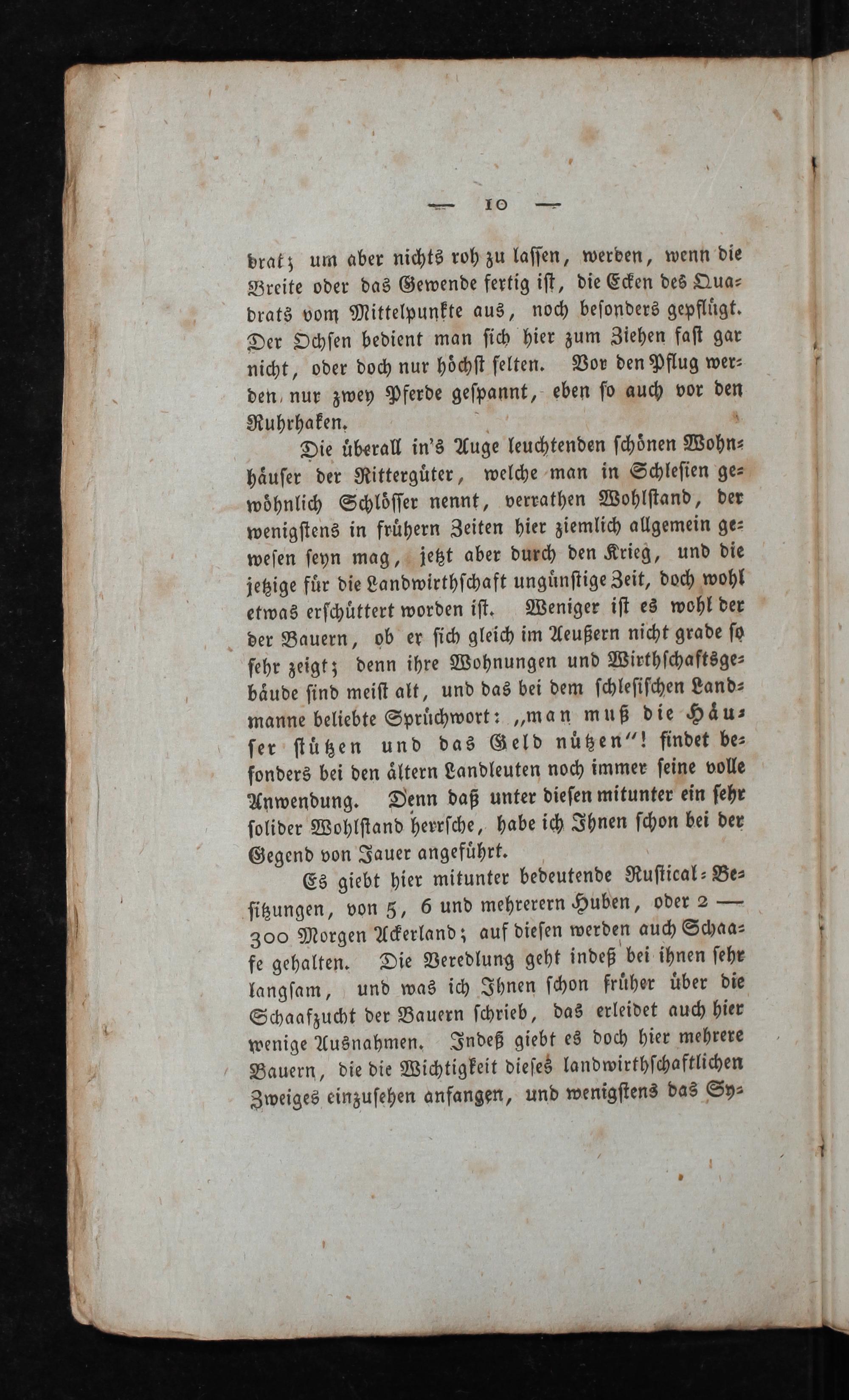 wöhnlich Schlöſſer nennt, verrathen Wohlſtand, der wenigſtens in frühern Zeiten hier ziemlich allgemein ge- weſen ſeyn mag, jeßt aber durch den Krieg, und die jehige für die Landwirthſchaft ungünſtige Zeit, doch wohl etwas erſchüttert worden iſt. Weniger iſt es wohl der der Bauern, ob ex ſich gleich im Aeußern nicht grade ſo fehr zeigtz denn ihre Wohnungen und Wirthſchaftsge- bäude ſind meiſt alt, und das bei dem ſchleſiſchen Land- manne beliebte Sprüchwort:„man muß die Häu? ſer ſtüßen und das Geld nüßen“! findet be- fonders bei den ältern Landleuten noch immer ſeine volle Anwendung. Denn daß unter dieſen mitunter ein ſehr ſolider Wohlſtand herrſche, habe ih Ihnen ſchon bei der Gegend von Jauer angeführt.