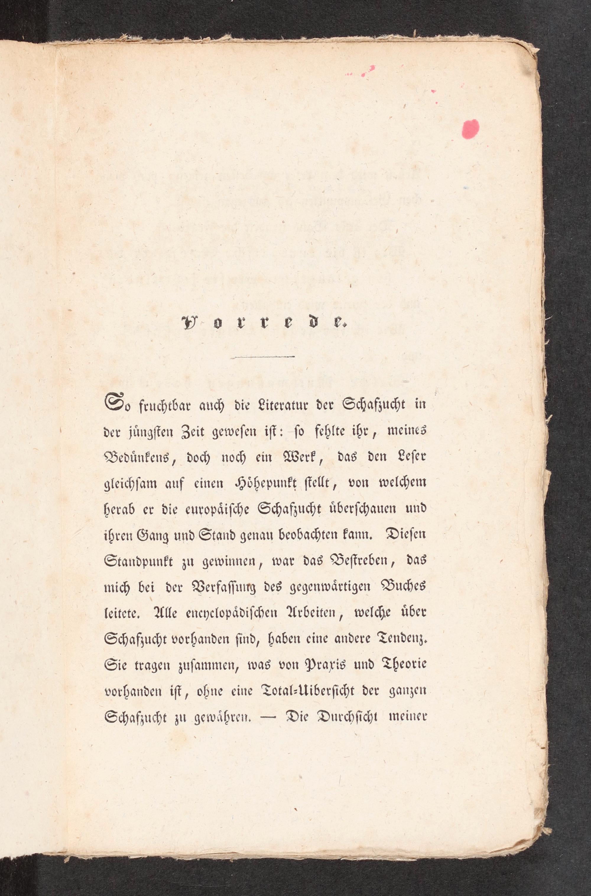 So fruchtbar auch die Literatur der Schafzucht in| ' der jüngſten Zeit geweſen iſt: ſo fehlte ihr, meines Bedünkens, dom; no< ein Werk, das den Leſer gleichſam auf einen Höhepunkt ſtellt, von welchem herab er die europäiſche Schafzucht überſchauen und ihren Gang und Stand genau beobachten kann, Dieſen Standpunkt zu gewinnen, war das Beſtreben, das mich bei der Verfaſſurg des gegenwärtigen Buches leitete, Alle encyclopädiſchen Arbeiten, welche über Schafzucht vorhanden ſind, haben eine andere Tendenz, Sie tragen zuſammen, was von Praxis und Theorie vorhanden iſt, ohne eine Total-Uiberſih<t der ganzen