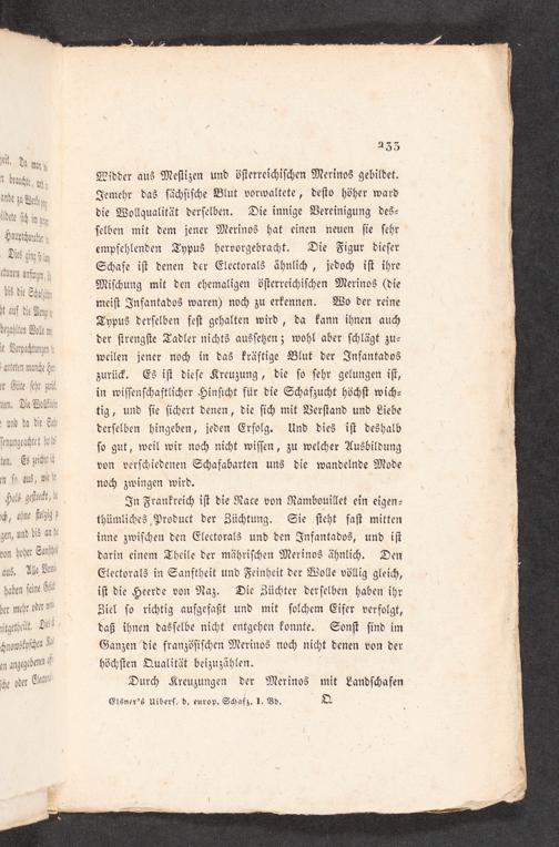 In Frankreich iſt die Nace von Rambouillet ein eigen- thümliches Product der Züchtung. Sie ſteht faſt mitten inne zwiſchen den Electorals und den Infantados, und iſt darin einem Theile der mähriſchen Merinos ähnlich. Den Electorals in Sanftheit und Feinheit der Wolle völlig gleich, iſt die Heerde von Naz. Die Züchter derſelben haben ihr Ziel ſo richtig aufgefaßt und mit ſolchem Eifer verfolgt, daß ihnen dasſelbe nicht entgehen konnte. Sonſt ſind im Ganzen"die franzöſiſchen Merinos noch nicht denen von der höchſten Qualität beizuzählen.