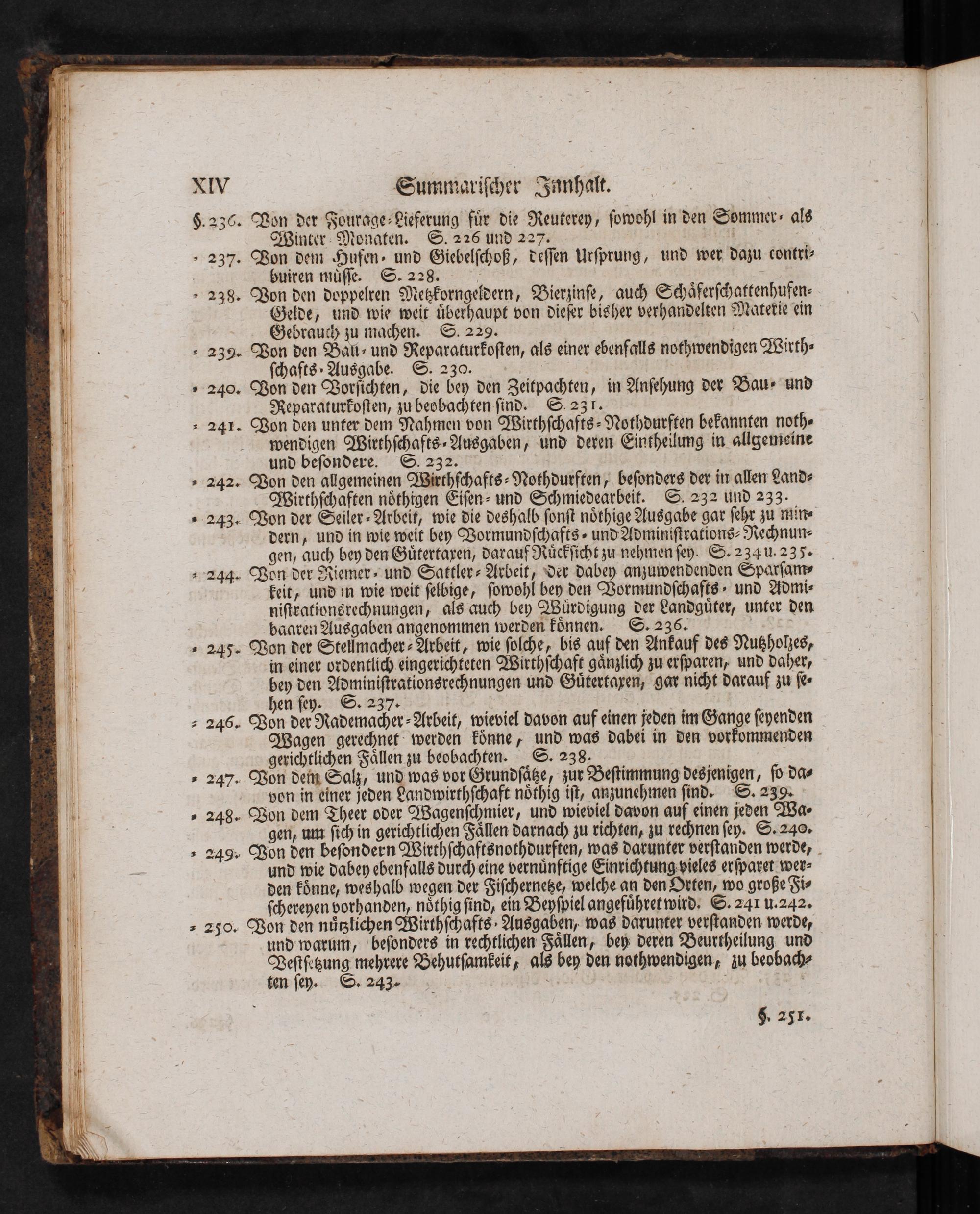 - 244. Won der Riemer- und Sattler- Arbeit,"der dabey anzuwendenden Sparſam» keit, und in wie weit ſelbige, ſowohl bey den Vormundſchafts- und Admi- niſirationsre<hnungen, als auch bey Würdigung der Landgüter, unter den baarein Ausgaben angenommen werden können. S. 236.'