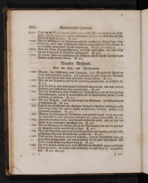 “ 226.. Warn, bey Abſchätzung eines Landgutes, dieſe Wirthſchafts- Rubrik die meiſte Aufmerkſamkeit verdiene, und daß dahin die alten Säße und VWorſchrif- ten zu unſern Zeiten nicht mehr gebrauchet werden können. S.- 455- S5 Zu um den Holzertrag gehörig und zuverläßig auszumitteln, zu verfahren ſey- . 455. 228. Daß der Ertrag einer jeden Holzart beſonders auszumitteln, und was dabey in Anſehung der verſchiedenen Lage zu beobachten. S. 456. Ee) 229. Von den Maſthölzern, derer verſchiedenen Beſchaffenheit, und wie bey derſelben Veranſchlagung, wobey es hauvrſächlich auf die Ausmittelung zweyer Punkte anfömmt, zu verfahren. S. 457.: M. * 230. Wie das Maſtgeld, nach Verſchiedenheit dey Maſtarten,'auf immerwährend: 1 zu beſtimmen. ſey>». S. 458. NE."2; 234+. Daß. bey den Maſthölzern kein Holz zum Verkauf in Anſchlag zu bringen, auſſer denen wegen Alter oder anderer Zufälle abgeſtorbenen Bäumen, welche zu dem Brennholz zurechnen. S. 458.| j DiE 232. Warum, bey Taxirung des Maſtholzes, auch zugleich darauf, ob ein gemingſa- mer Zuwachs von allen Zeitaltexn vorhanden ſey, geſehen exden müſſe. S.459. 233. Von«dem lebendigen Holz, was darunter verſtanden werde, und auf was: vor Weiſe es am bequemſten abzuſchätzen ſey. S. 460. 9970 234- Von der Abnugutig des übrigen Theiles dex Waldungen, und auf wie mancher- ley Holzarten dabey vornehmlich zu ehen. S. 460. 2 235 Von dem Brennholz, was dazu eigentlich zurechnen; und warum auch auf deſſen | verſchiedene Güte und Beſchaffenheit zu ſehen ſey. S. 4615- nä DE 236. Daß bey dem Brennholz zuvörderſt dasjenige, was zur Wirthſchaft nöthig iſt, abgerechnet werden müſſe, und warum deshalb für ein jedes WWirthſchafts-Ge- ſchäfte gewiſſe Säge veſtzuſekßen nöthig iſt- S. 462.“ * 237. Won den Söken, die bey einem jeden Wirthſchafts-Geſchäfte wegen des Brehn» holzes, an Orten, wo ſolches nicht übermäßig ray und theuer iſt, anzunehmen ſind. S, 462, und 453. g, 233 :, 238