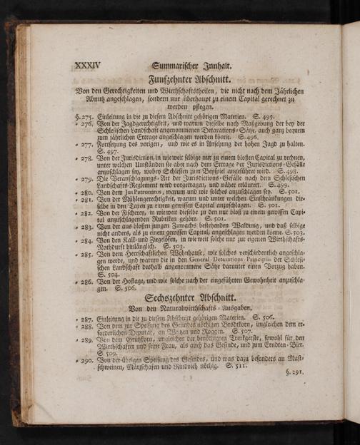- 276. Won der Jagdgerechtigkeit- und warum dieſelbe nach Maßgebung der bey der „Schleſiſchen Landſchaft angenommenen Detaxations- Sätze, auch ganz bequem zum jährlichen Ertrage angeſchlagen werden könne. S. 495.!