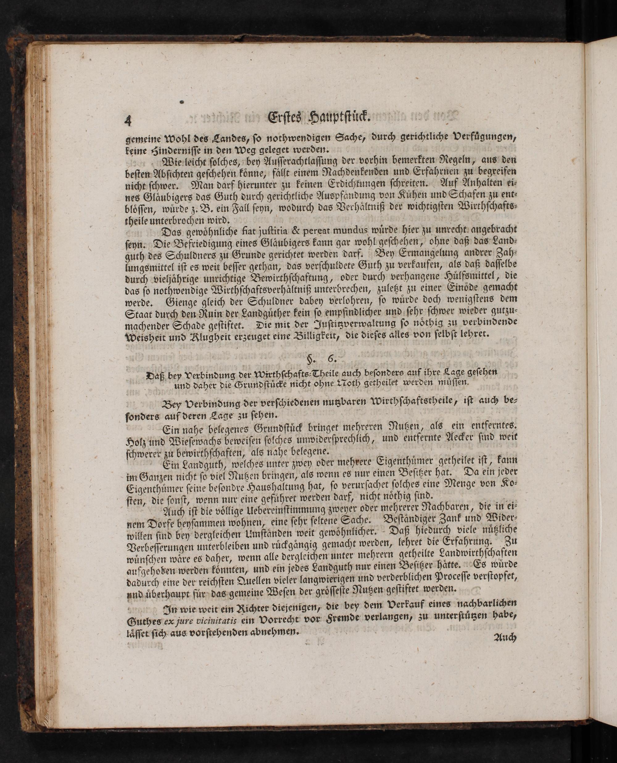 nem Dorfe beyſammet wohnen, eine ſehr ſeltene Sache. Beſtändiger Zank und Wider- willen ſind bey dergleichen Umſtänden weit gewöhnlicher.- Daß hiedurc<h viele nüßliche Verbeſſerungen unterbleiben und rückgängig gemacht werden, lehret die Erfahrung. Zu wünſchen wäre es daher, wenn alle dergleichen unter mehrern getheilte Landwirthſchaften au gehoben werden könnten, und ein jedes Landguth'nur einen Beſißer hätte.:“Es würde dadurch eine der reichſten Quellen vieler langwierigen und verderblichen Proceſſe verſtopfet, und. überhaupt: für» dasgemeine Weſen der gröſſeſte Nußemgeſtiftet. werden.