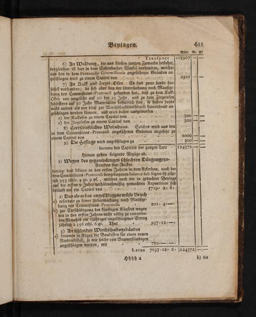 * Tranſport | n. Zuwachs beſtehet, |dergleichen iſt hier in dem Sadenbacher Winkel vorhanden, welcher Jays den in dem-Protocollo Commiſlionis angeführten Gründen an-| | geſchlagen wird zu einem Capikalivon'%.-145>< 4: 2 7) An Ralk und Ziegel- Ofen. Es. ſind zwar beyde hie- ſelbſt vorhanden 3 da ſich aber bey» der:Unterſuchung nach Maaßze- [bung des Commißions-Prorocoll gefunden hat, daß zu dem Kalk- Ofen nur ungefähr auf 20 bis 25 Jahr, höchſtens auf 32 Jahr Materialien befindlich ſind, ſo haben beyde nicht anders als nur bloß zur Wirthſchaftsnothdurft hinreichend an- I geſchlagen werden können, und wird daher"ausgeworfen a). der Kalkofen zu einem Capital von-