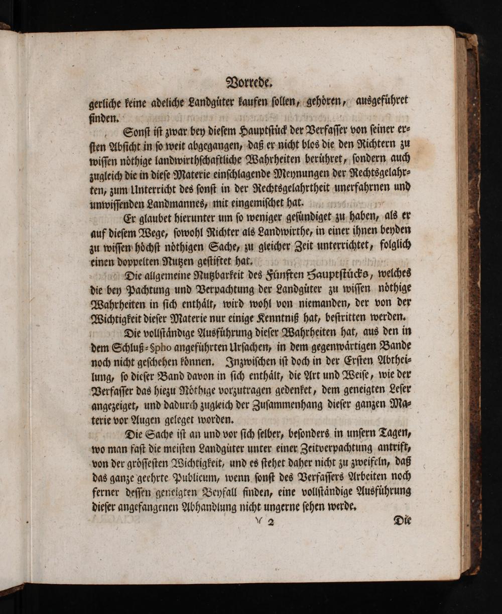 Die allgemeine Nutzbarkeit des Fünften=5auptſtücks, welches die'bey Pachtung und Berpachtung der Landgüter zu wiſſen nöthige Wahrheiten in ſich enthält, wird wohl von niemanden, der von der Wichtigkeit dieſer Materie nur einige Kenntniß hat, beſtritten werden,