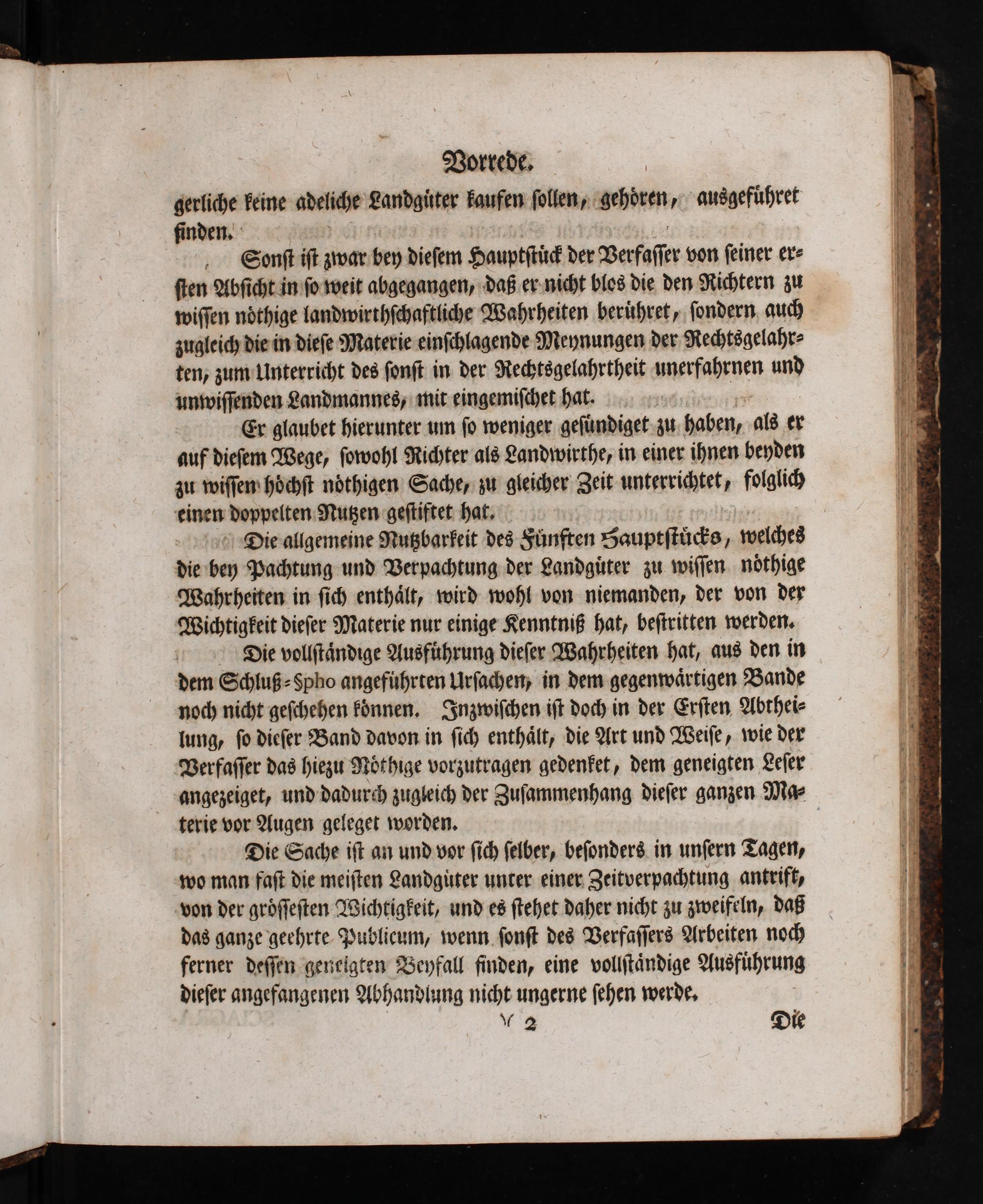 Die Sache iſt an und vor ſich ſelber, beſonders. in unſern Tagen, wo man faſt die meiſten Landgüter uncer einer Zeitverpachtung antrifty von der gröſſeſten Wichtigkeit, und es ſtehet daher nicht zu zweifeln, daß das ganze geehrte Publicum, wenn ſonſt des Berfaſſers Arbeiten noc< ferner deſſen geneigten Beyfall finden, eine vollſtändige Ausführung dieſer angefangenen Abhandlung nicht ungerne ſehen werde,