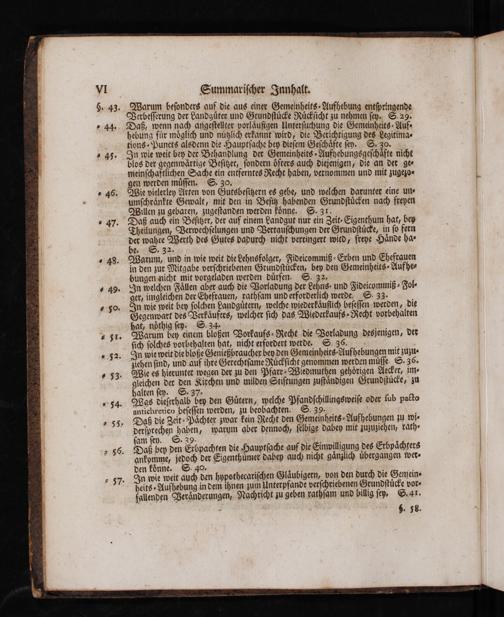 Warum beſonders auf die aus einer Gemeinheits- Aufhebung entſpringende Verbeſſerung der Landgüter und Grundſtücke Rückſicht zu nehmen ſey. S. 29. Daß, wenn nach angeſtellter vorläufigen Unterſuchung die Gemeinheits- Auf- hebung für möglich und nüßlich erkannt wird, die Berichtigung des Legitima- tions- Puncts alsdenn die Hauptſache bey dieſem Geſchäfte ſey- Sv- 30.