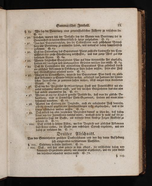 Urſachen; warum ſich der Verfaſſer bey der Materie von Bonitirung der in Gemeitiſchaft ſtehenden Grundſtücke ſo lange aufgehalten. S. 53.; Con dem Separationsplan, den die Commiſſarien nach geſchehener Wermeſ- ſung und Bonitirung zu entwerfen haben, und worauf es dabey hauptſächlich anfomme. S«- 63.»