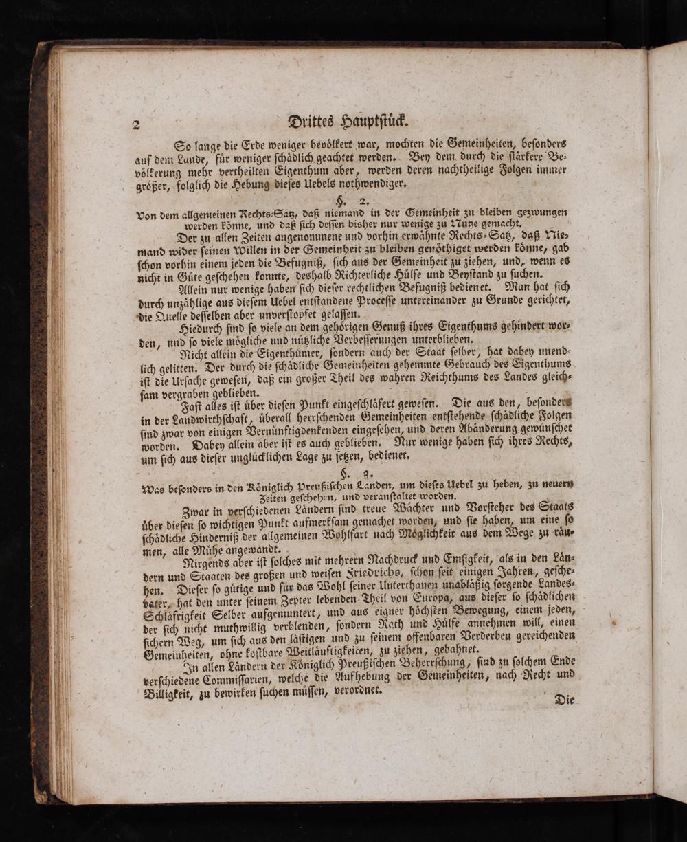 Nirgends aber iſt ſolches mit mehrern Nachdruck und Emſigkeit, als in den Län- dern und Staaten des großen und weiſen Sriedrichs, ſchon ſeit einigen Jahren, geſche- hen. Dieſer ſo gütige und fix das Wohl ſeiner Unterthanen unabläßig ſorgende Landes» vater, hat den unter ſeinem Zepter lebenden- Theil von Europa, aus dieſer ſo ſchädlichen Schläfrigkeit Selber aufgemuntert, und aus eigner höchſten Bewegung, einem jeden, der ſich nicht muthwillig verblenden, ſondern Nath und Hülfe annehmen will, einen ſichern Weg, um ſich aus den läſtigen und zu ſeinem offenbaren Verderben gereichenden Gemeinheiten, ohne koſtbare Weitläuftigkeicen, zu ziehen, gebahnet.