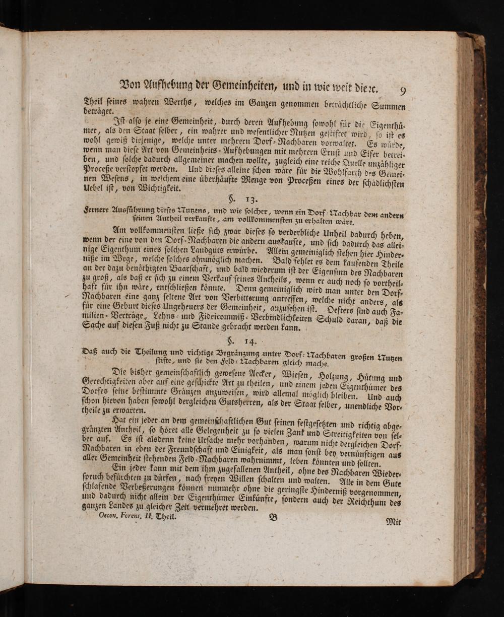 Hat ein jeder.an dem gemeinſchaftlichen Gut ſeinen feſtgeſeßten- und richtig abge- gränzten Antheil, ſo höret alle Gelegenheit zu ſp vielen Zanf und Streitigkeiten von ſel- ber auf. Es iſt alsdenn keine Urſache mehr vorhanden, warum nicht dergleichen Dorf- Nachbaren in eben der Freundſchaft und Einigfeit, als man ſonſt bey vernünftigen ays aller Gemeinheit ſtehenden Feld- Nachbaren wahrnimmt, leben könnten und ſollten.