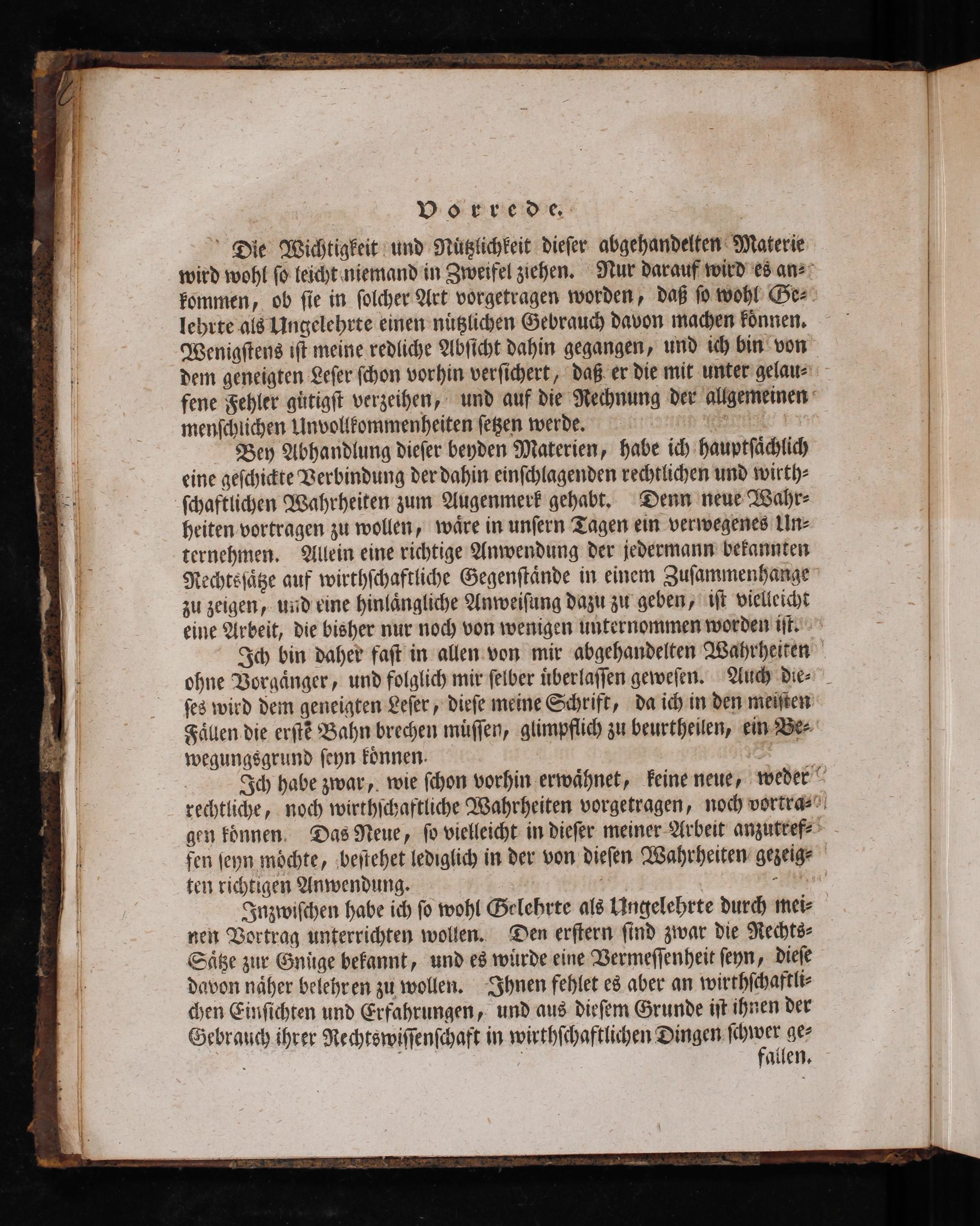 Bey Abhandlung dieſer beyden Materien, habe ich hauptſächlich eine geſchi>te Verbindung der dahin einſchlagenden rechtlichen und wirth- ſchaftlichen Wahrheiten zum Augenmerk gehabt, Denn neue Wahr- heiten vortragen zu wollen, wäre in unſern Tagen ein verwegenes Un- ternehmen. Allein eine richtige Anwendung der jedermann befannten