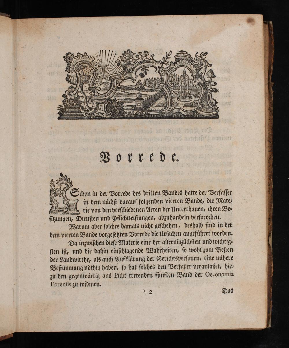 Da inzwiſchen dieſe Materie eine der allernüßzlichſten und wichtig- ſten iſt, und die dahin einſchlagende Wahrheiten, ſo wohl zum Beſtien der Landwirthe, als auch Aufklärung der Gerichtsperſonen, eine nähere Beſtimmung nöthig haben, ſo hat ſolches den Verfaßer veranlaßet, hie- zu den gegenwärtig ans Licht tretenden fünften Band der Oeconomia Forenüis zu widmen.