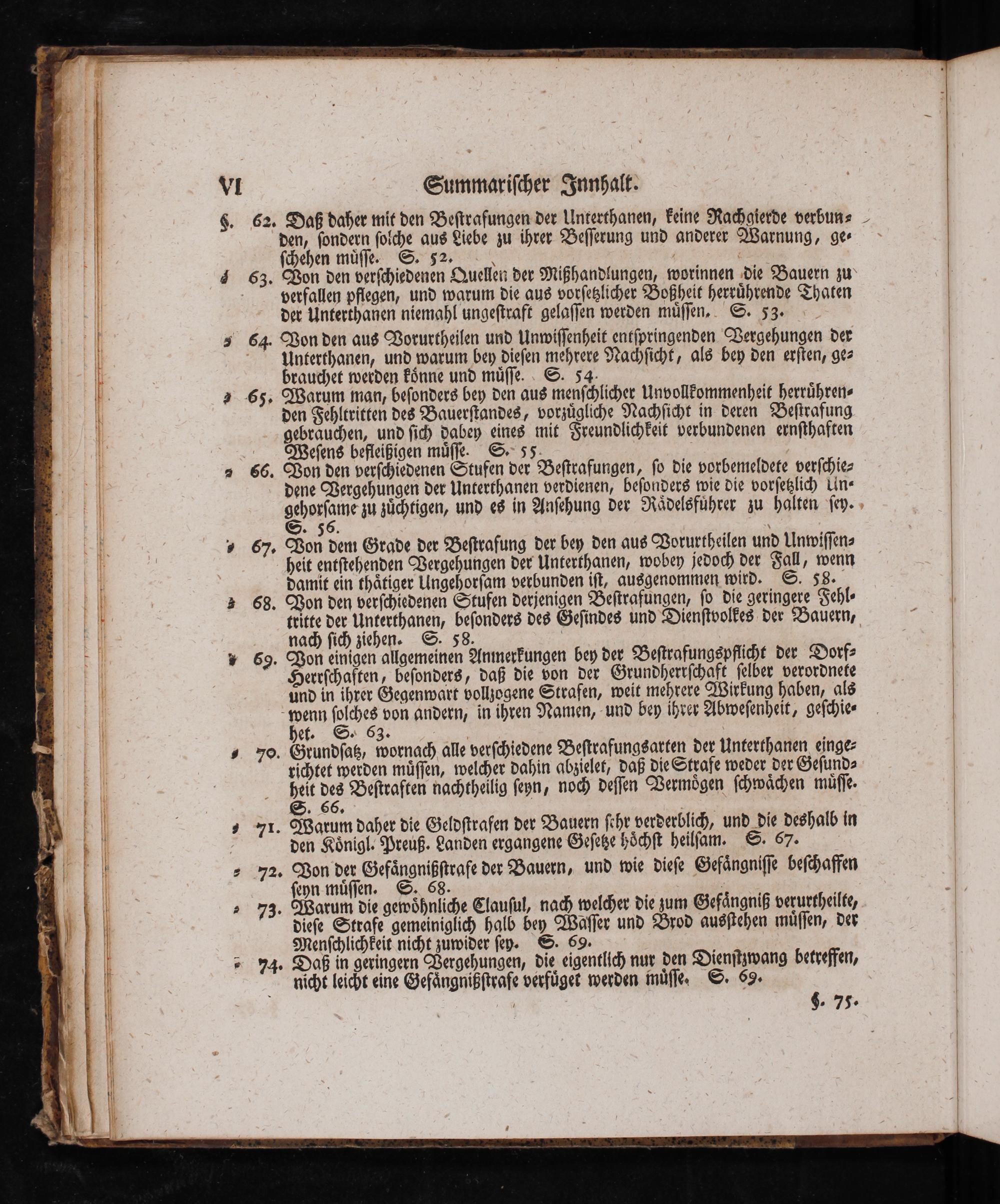 ſeyn müſſen. S. 68.! 46058: Warum die gewöhnliche Clauſul, nach welcher die zum Gefängniß verurtheilte, dieſe Strafe gemeiniglich halb bey Waſſer und Brod ausſtehen müſſen, der Menſchlichkeit nicht zuwider ſey- S-. 69-;