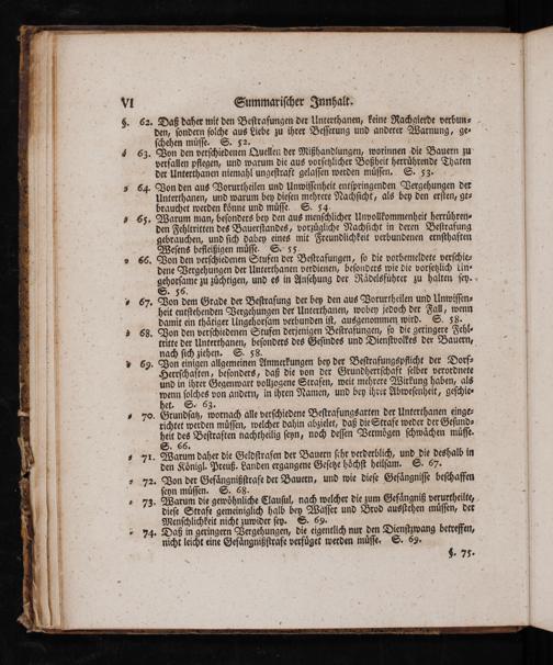 . 5. y Bon dem Grade der Beſtrafung der bey den aus Vorurtheilen und Unwiſſen- heit entſtehenden Vergehungen der Unterthanen, wobey jedoch der Fall, wenn Damit ein thätiger Ungehorſam verbunden iſt, ausgenommen wird. S. 58. Von den verſchiedenen Stufen derjenigen Beſtrafungen, ſo die geringere Fehl-