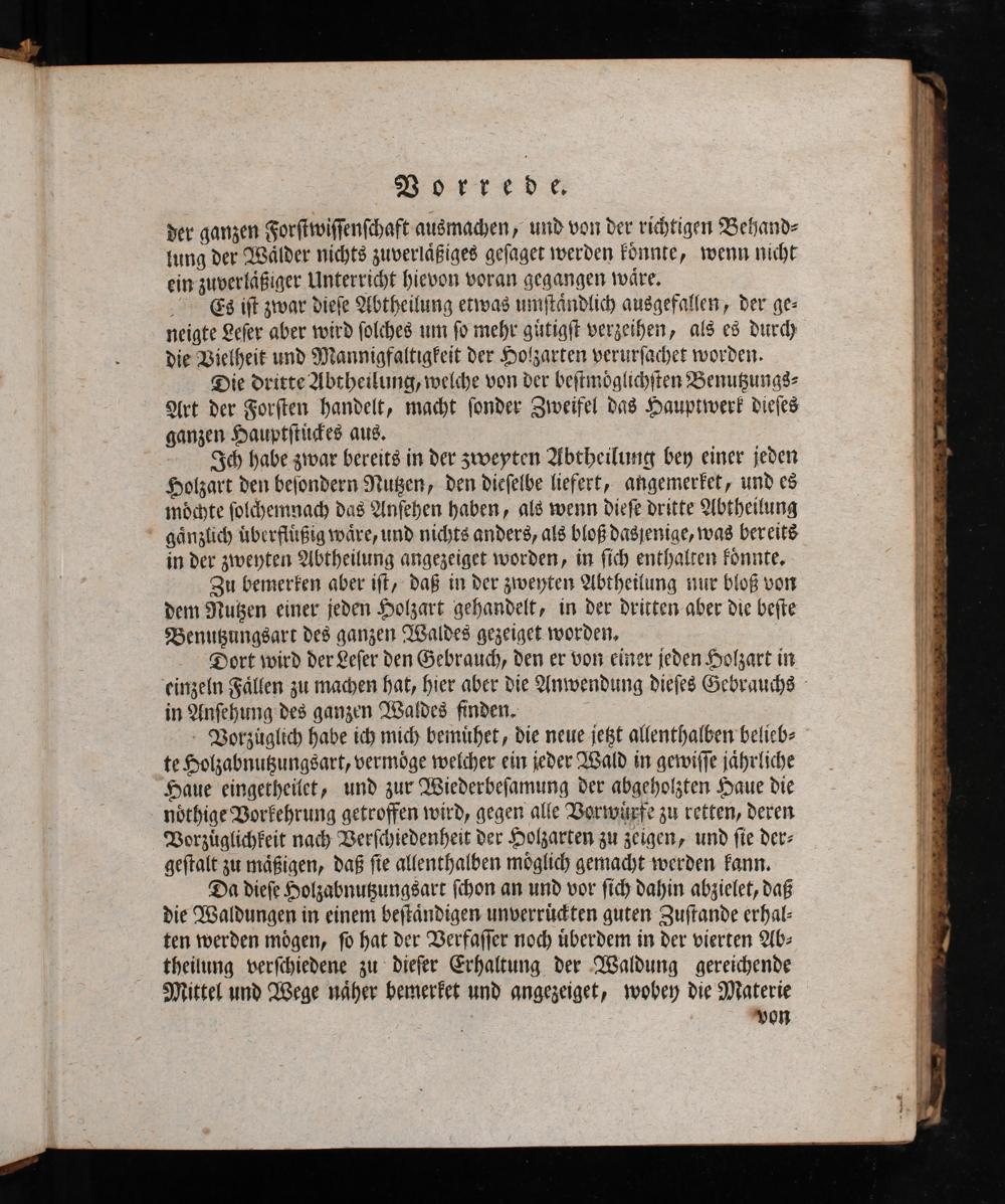 Zu bemerken aber iſt, daß in der zweyten Abtheilung nur bloß von dem Nußen einer jeden Holzart gehandelt, in der dritten aber die beſte Benußunggsarr des ganzen Waldes gezeiget worden,
