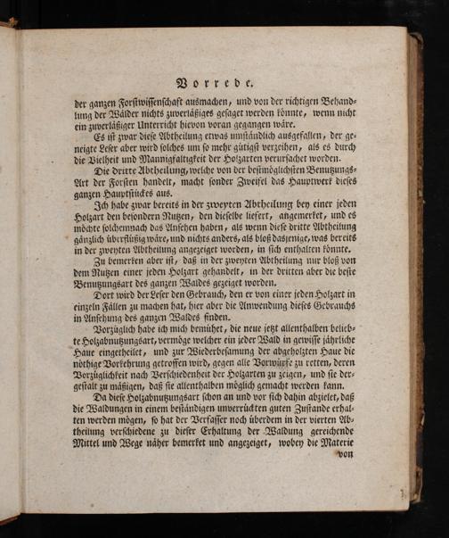 Vorzüglich habe ich mich bemühet, die neue jeßt allenthalben belieb- te Holzabnußungsart, vermöge welcher ein jeder Wald in gewiſſe jährliche Haue eingetheilet, und zur Wiederbeſamung der abgeholzten Haue die nöthige Borfehrung getroffen wird, gegen alle Vorwärxte zu retten, deren Vorzüglichkeit nach Verſchiedenheit der Holzarten zu zeigen, und ſie der- geſtalt zu mäßigen, daß ſie allenthalben möglich gemacht werden kann.